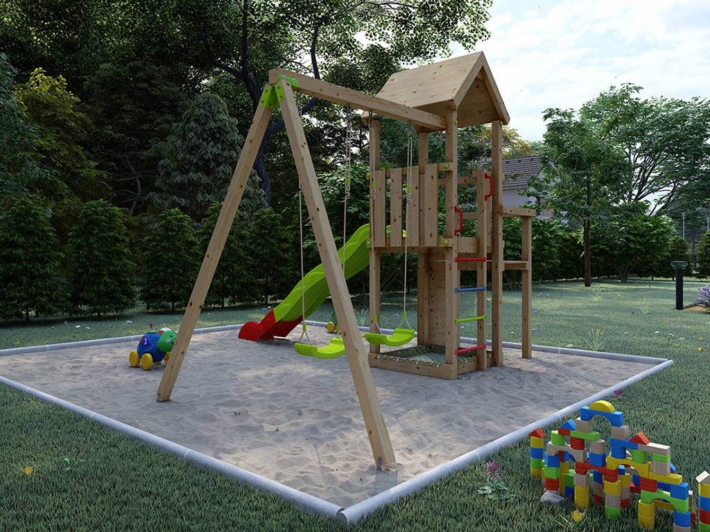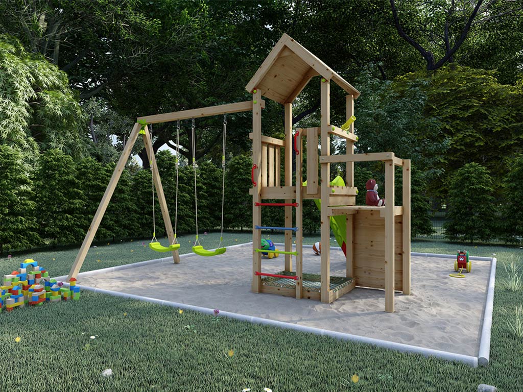 | Leveringsomvang: | Speeltoren, glijbaan, dubbele schommel, zandbak, platform, zandbaknet, klimwand, metalen ladder, telescoop, 2 schommelzitjes, 2 handgrepen, paalankers, verbindingsstukken |