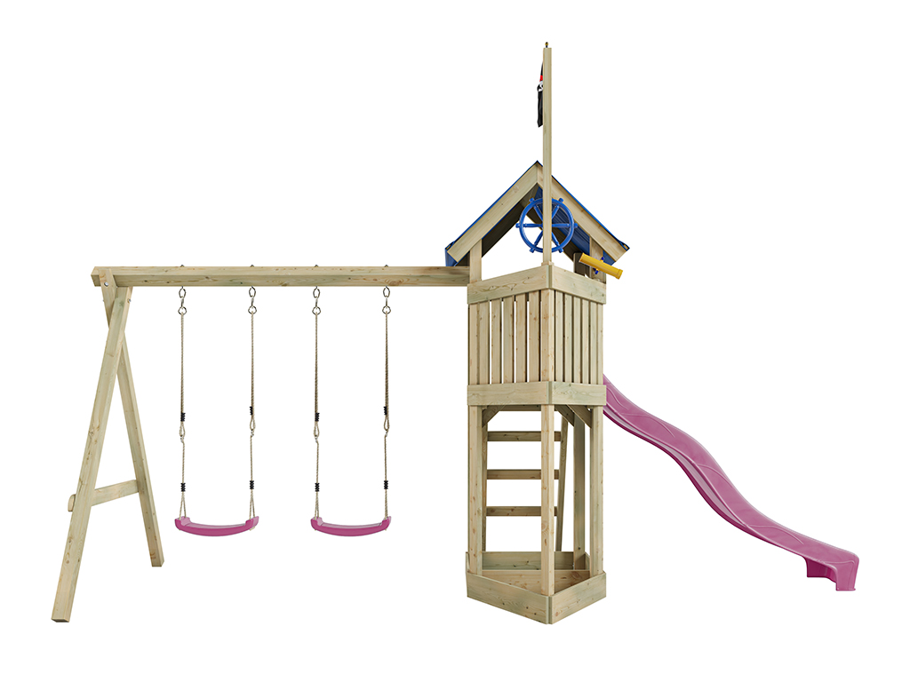 Geïmpregneerd houten speeltoren Captain Jolly incl. dubbele schommel incl. glijbaan roze + zitjes roze Outgarden