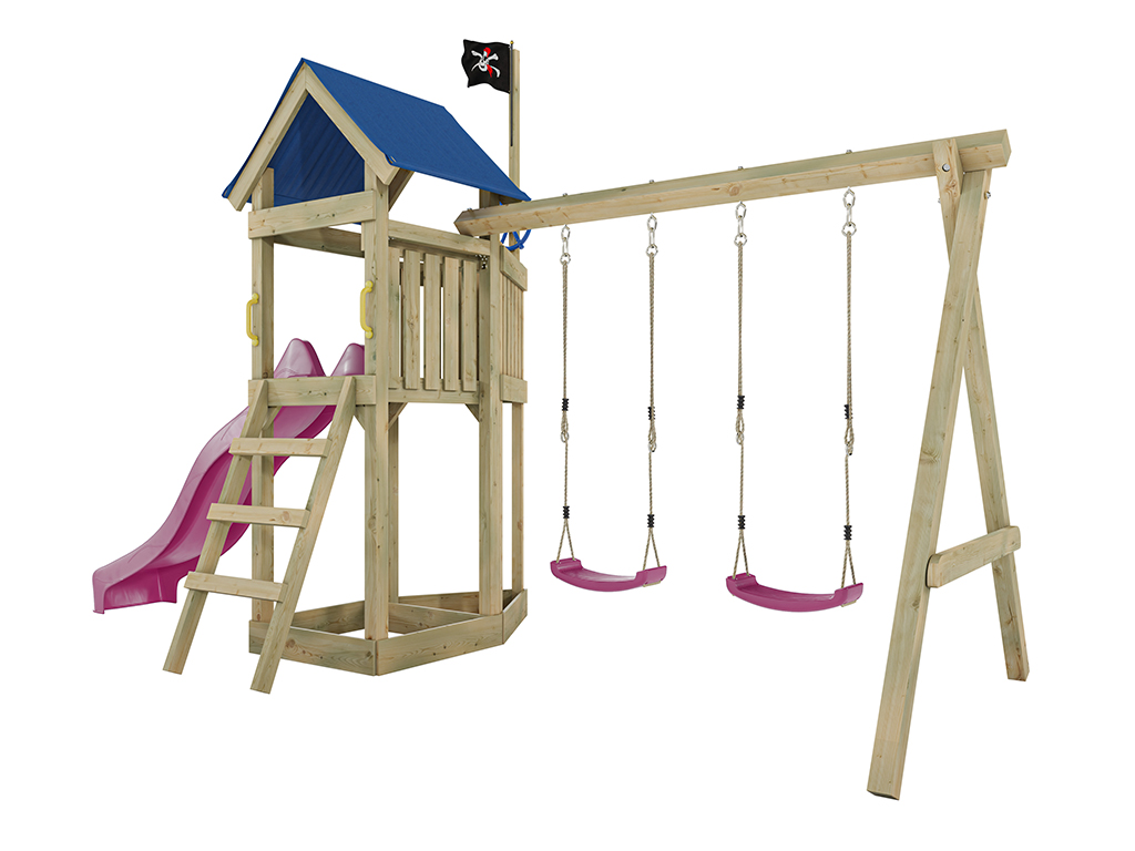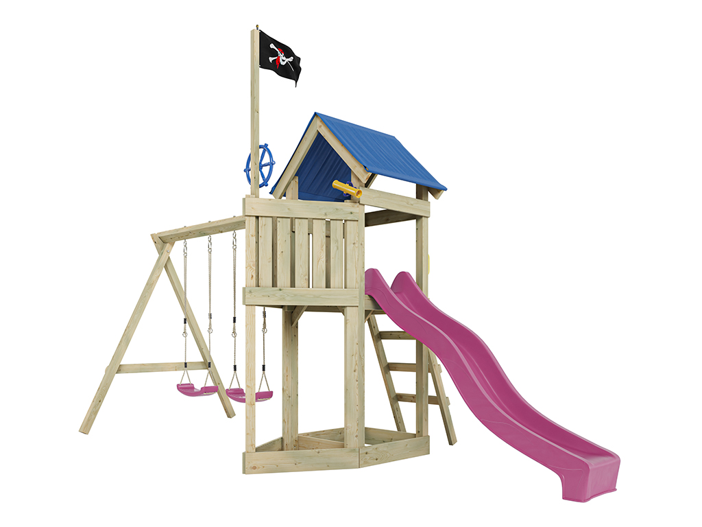 Speeltoren van geïmpregneerd hout "Pirat Captain Jolly" met dubbele schommel incl. glijbaan roze en