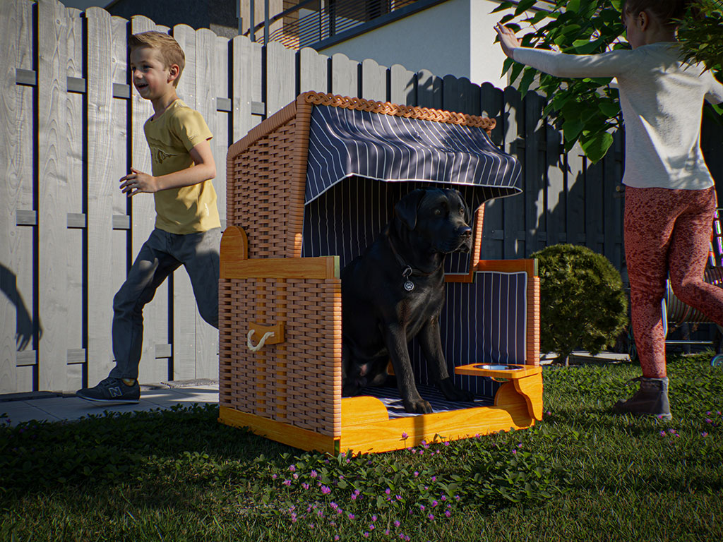 Net als bij andere tuinmeubelen is Rattan het ideale materiaal voor de honden-strandkorf. Het materiaal is onderhoudsvriendelijk en behoudt ook bij sterke weersomstandigheden zijn vorm en kleur. Het grenenhout draagt dankzij zijn eigenschappen eveneens bij aan een langdurig gebruik.