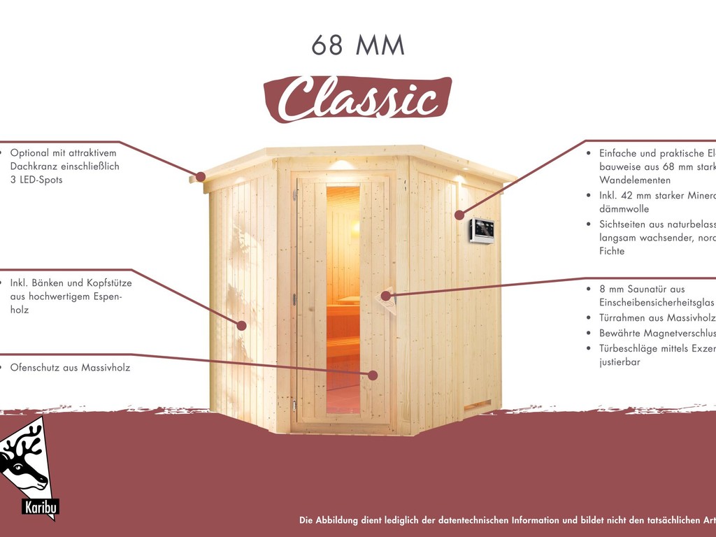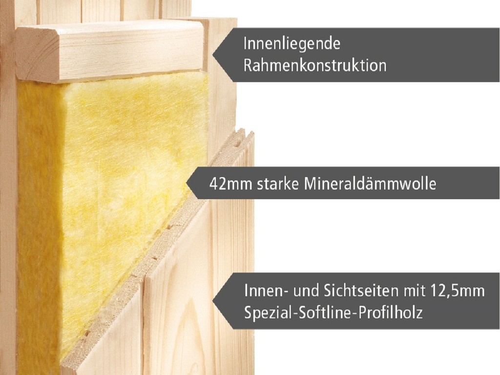 De buitenwanden van de zichtzijden bestaan uit twee lagen hout van 12,5 mm dik, gemaakt van ademend vochtregulerend speciaal Softline-profielhout en een isolatielaag van 42 mm minerale wol. Het dak van 57 mm dik is voorzien van een speciale plaat en minerale wol. Met een wanddikte van 68 mm zijn systeem-sauna's optimaal geïsoleerd en daardoor bijzonder energiezuinig. Door de zeer goed geïsoleerde elementen warmt de systeemsauna extra snel op.