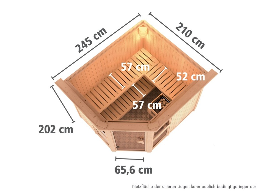 Bij de montage van een sauna moet een minimale afstand van 10 cm tot muren en plafond strikt worden aangehouden om een goede luchtcirculatie te waarborgen. Zo kan vochtige en warme lucht beter worden afgevoerd. In dit verband moeten ook de minimale hoogte en breedte van de ruimte in acht worden genomen. Karibu - Natuurproducten van hoge kwaliteit