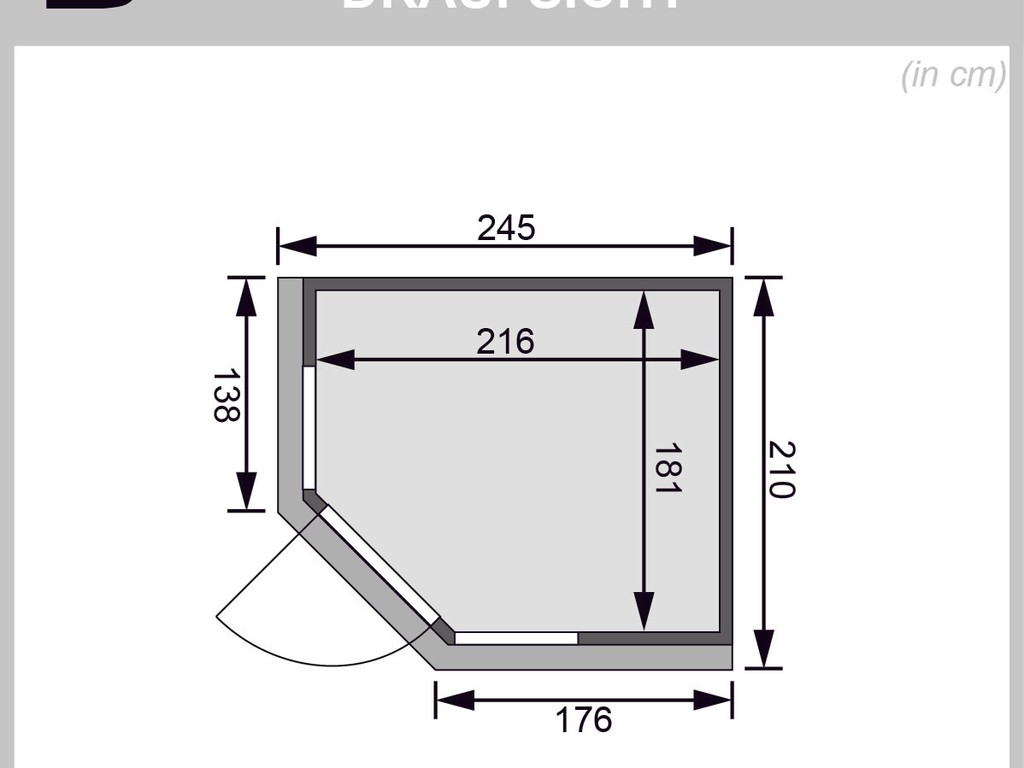 L X B X H: 245 x 210 x 202 cm, incl. 3 ligbanken, incl. 9 kW Bio-Combi-kachel + ext. besturing