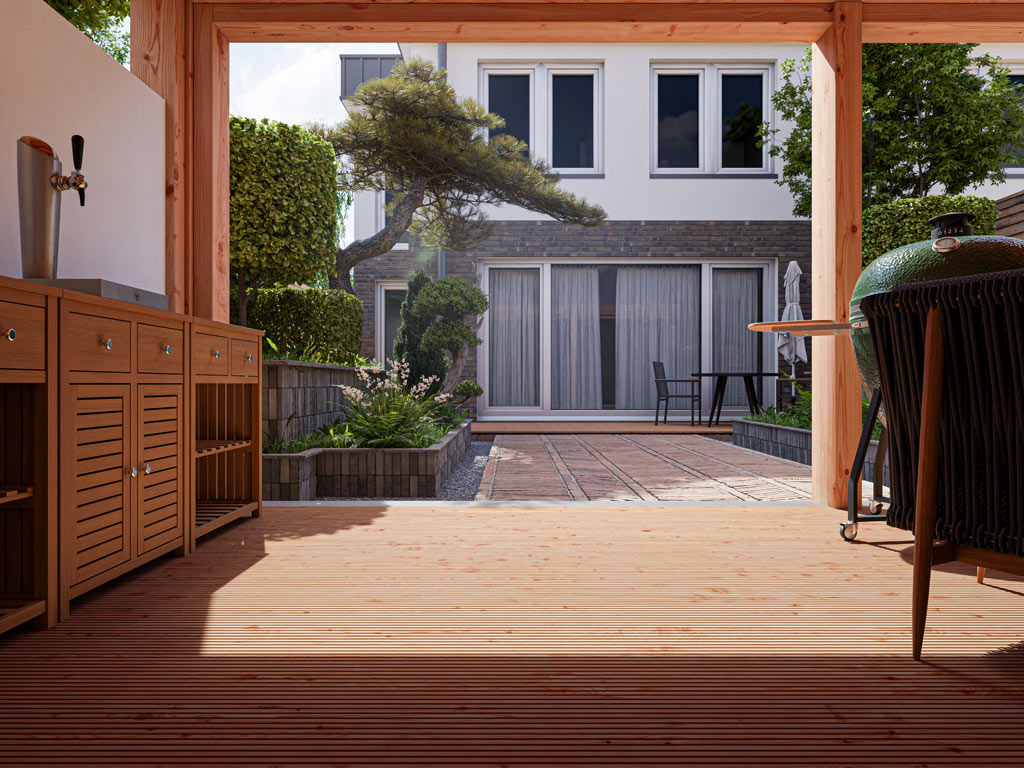 Regelmatige behandeling van UV-ondoorlatende coatings kan de weersgerelateerde vergrijzing van het hout in de loop van de tijd tegengaan en het fraaie karakter van de planken voor lange tijd behouden.