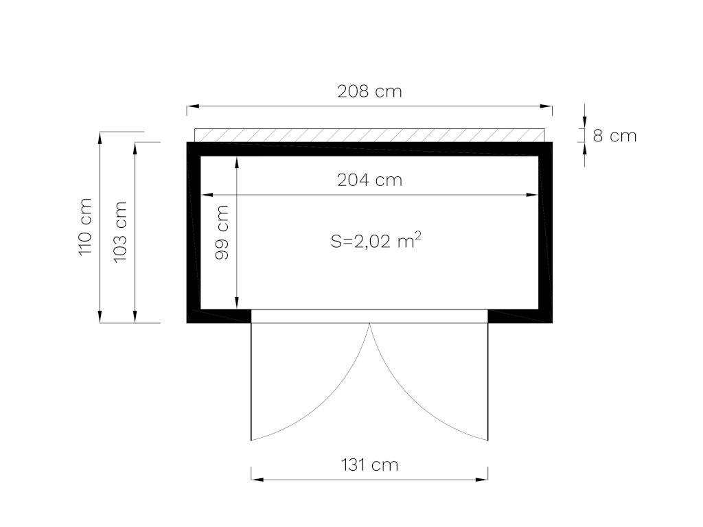 | Buitenmaten met dakoverstek (B x D): | 208 x 110 cm |