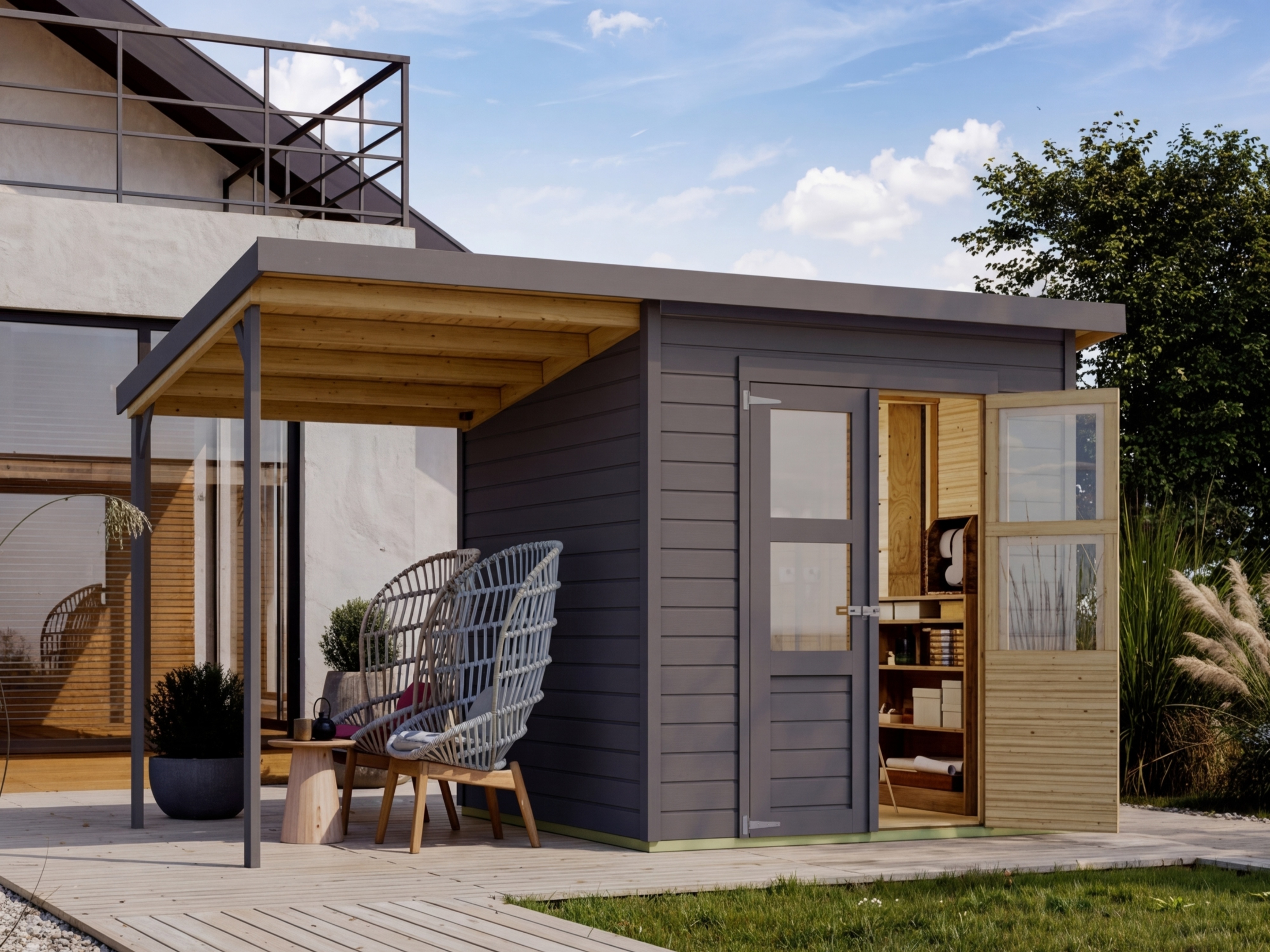 Gerätehaus Merseburg 5 14 mm terragrau met aanbouw van 140 cm KARIBU
