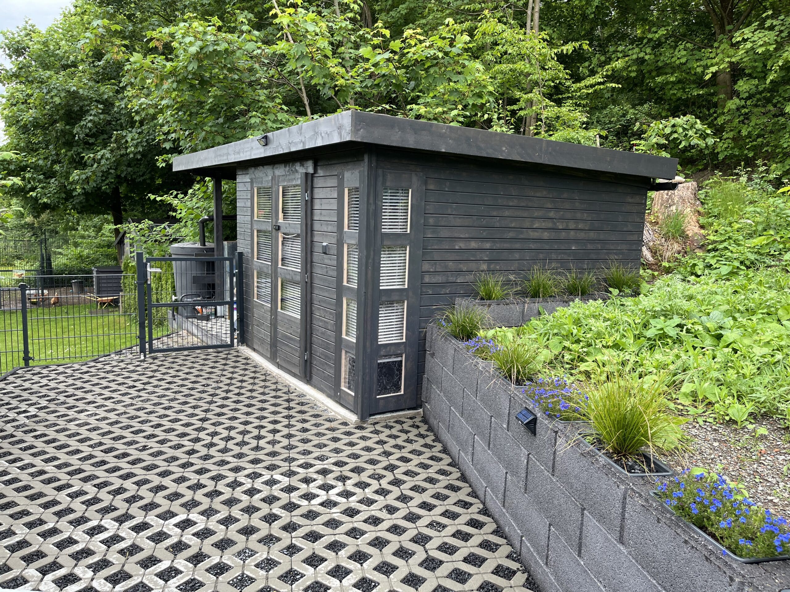 Met zijn geringe wanddikte van slechts 19 mm is het tuinhuis ideaal voor het opberggen van fietsen en tuingereedschap. Gemakkelijk te monteren voldoet deze eenvoudige uitvoering volkomen als beschutting of opbergruimte.