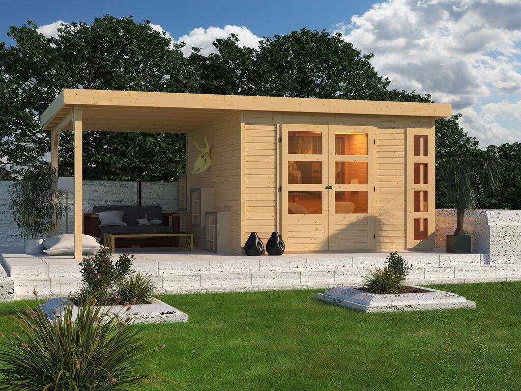 Dit tuinhuis met aangebouwde overkapping biedt meer ruimte en een breed scala aan gebruiksmogelijkheden. Het royaal geproportioneerde verlengdak maakt het mogelijk om volop te genieten van het dagelijks leven in de open lucht ? beschermd tegen zon, wind en regen. De ruimte onder de overkapping kan bij elk weer als gezellig terras worden gebruikt om te zitten, spelen of werken. Als alternatief is hij ook geschikt als optimale opslagruimte voor tal van tuingereedschappen.