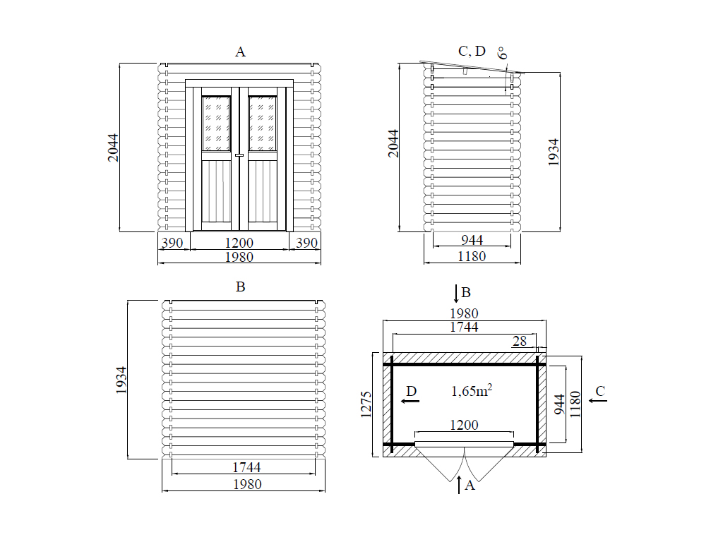 Het grondoppervlak van het tuinhuis bedraagt 1,65 m² met een basisafmeting van 174,4 x 94,4 cm (b x d). Door een nokhoogte van 204,4 cm is een optimale benutting van de ruimte gegarandeerd.