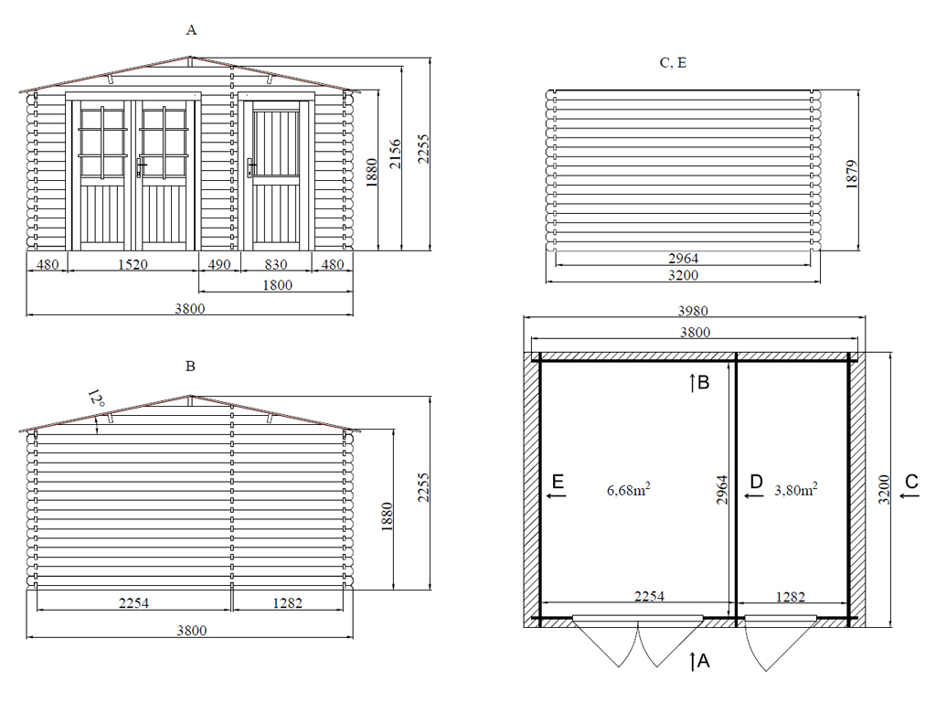 Het grondoppervlak van het tuinhuis bedraagt 10,48 m² met een basisafmeting van 380 x 320 cm (b x d). Door een nokhoogte van 225,5 cm is een optimale benutting van de ruimte gegarandeerd. Lees meer over de verschillende afmetingen in onze gids.