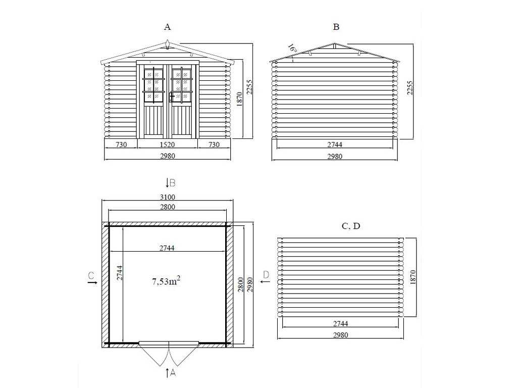 Het grondoppervlak van het tuinhuis is 8,18 m² met een basisafmeting van 277,2 x 277,2 cm (B x D). Door een nokhoogte van 225,5 cm is een optimale benutting van de ruimte gegarandeerd.