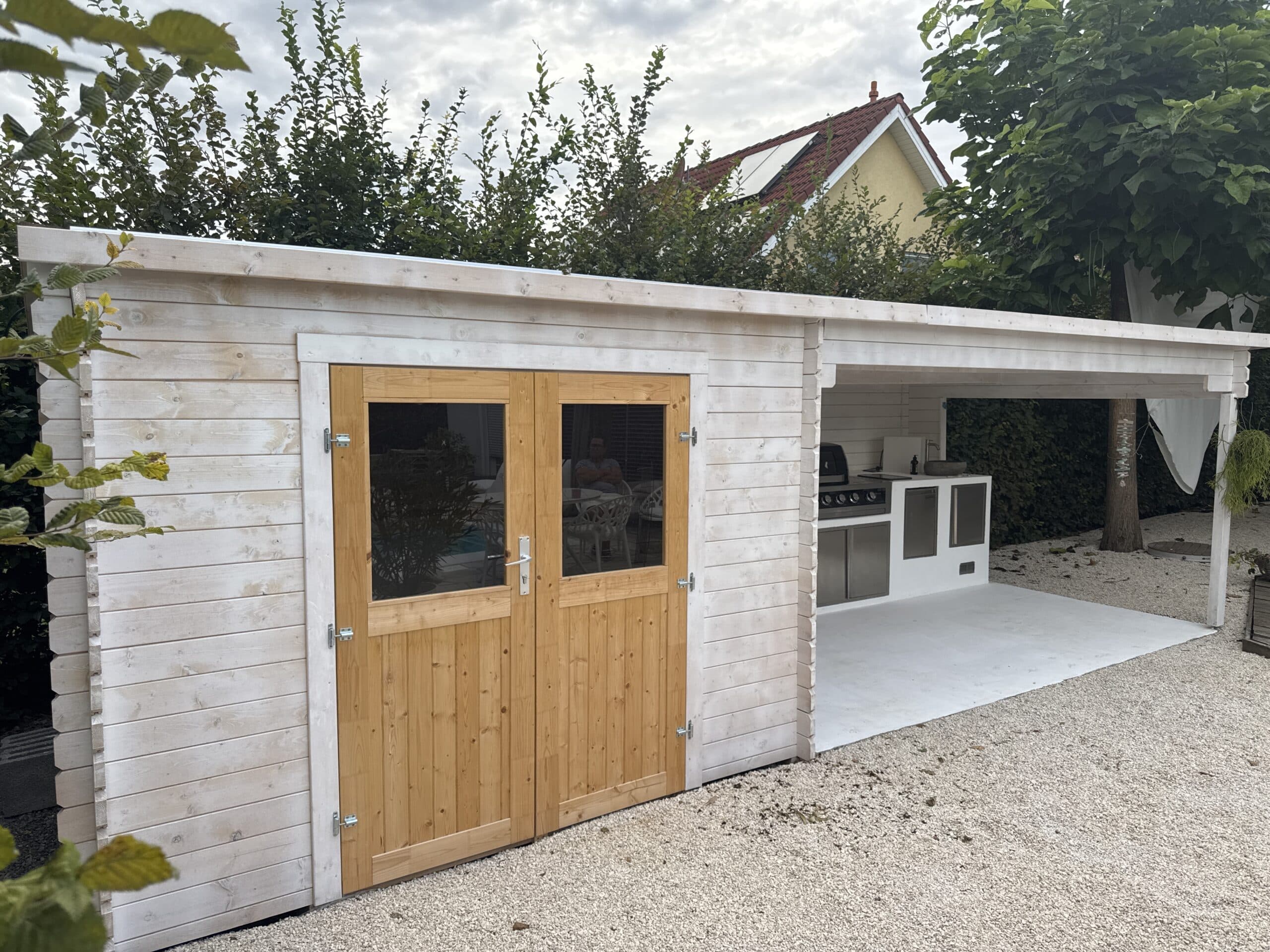 De constructie was geen probleem. Veel ruimte in de gereedschapsschuur en het terras is erg groot. Wij verven hem terragrijs met wit. Perfect tuinhuis om tot rust te komen en iedereen zal ervan genieten.