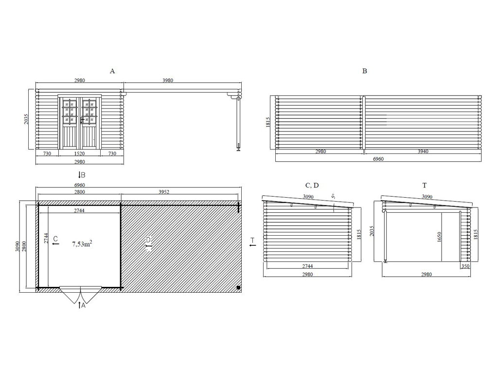 B x D x H: 696 x 309 x 203 cm, Basisafmeting huis: B x D: 280 x 280 cm, incl. 4 m aanbouw met achterwand