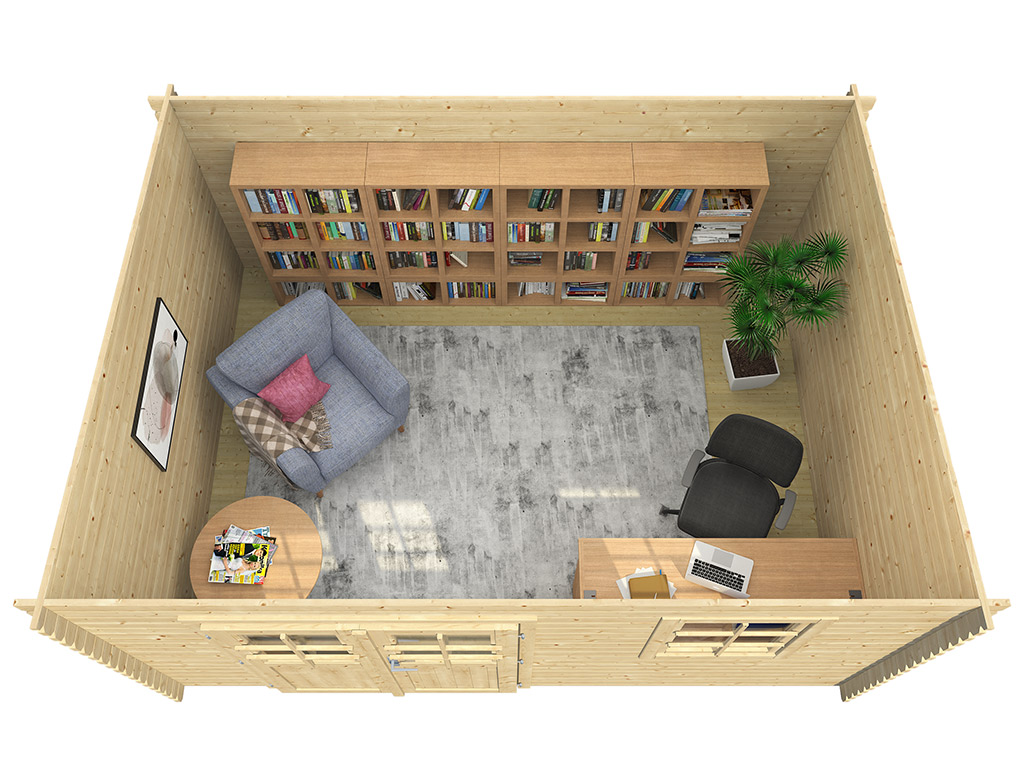 28 mm dikke blokhut met een brede dubbele vleugeldeur met lichtuitsparingen van echt glas