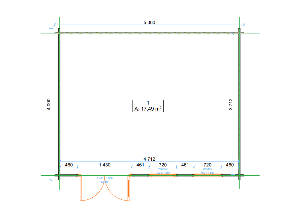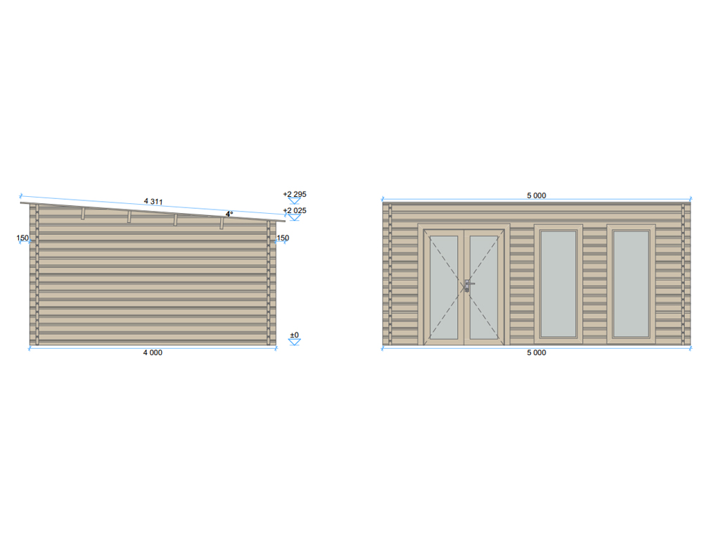 B x D x H: 500 x 430 x 229 cm, funderingsmaat tuinhuis: B x D: 500 x 400 cm, dubbel glas
