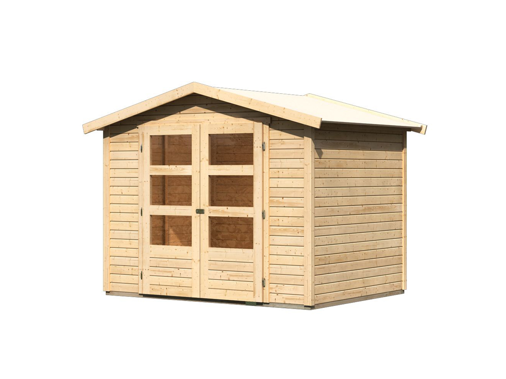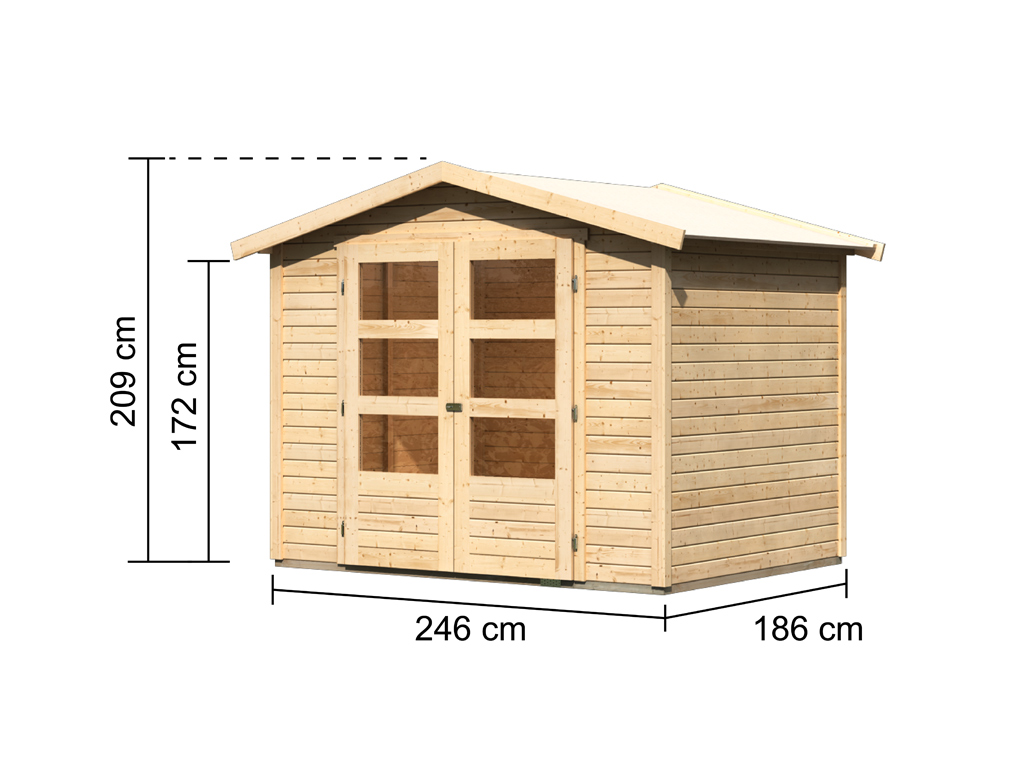 B x D x H: 246 x 186 x 209 cm, Basisafmeting huis: B x D: 242 x 182 cm, incl. Dubbele vleugeldeur met lichtuitsparingen