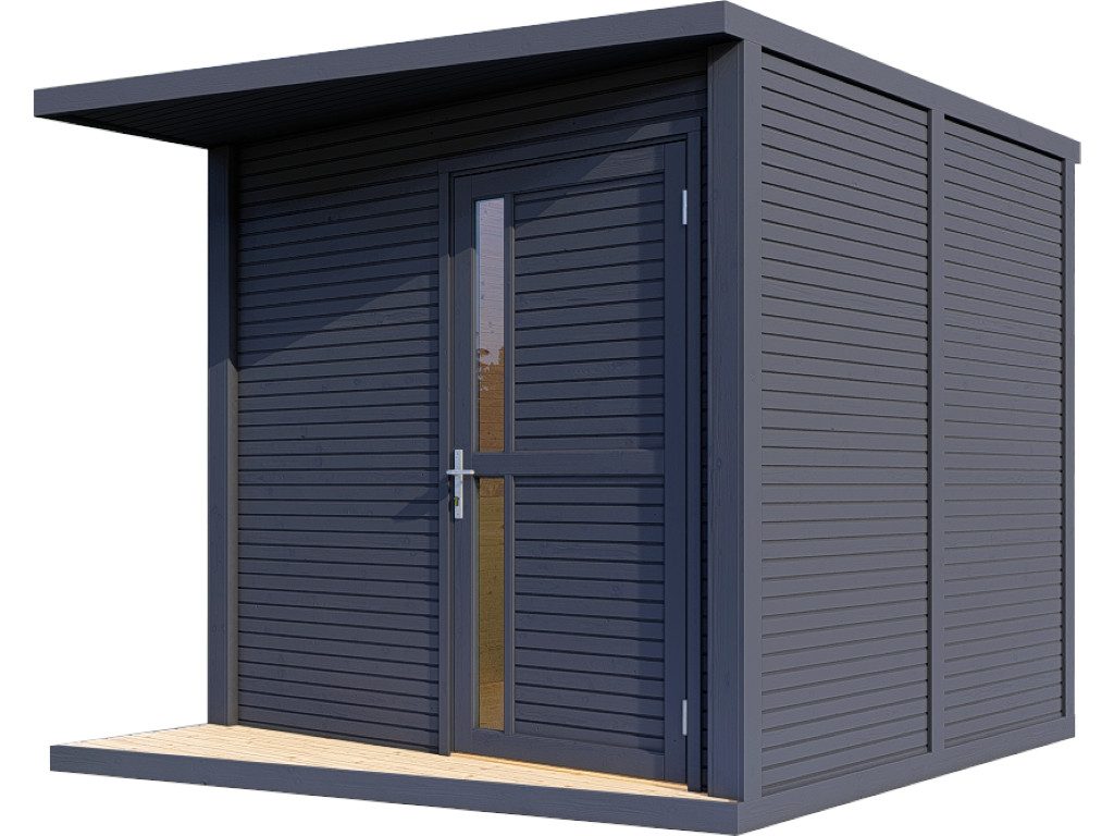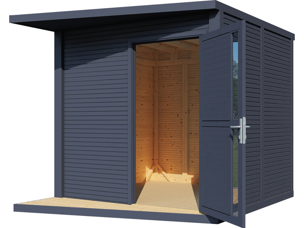 Futura-tuinhuis met plat dak in zeer stabiele, massieve elementconstructie met een elegant rhombusprofiel. Unieke vormgeving voor een moderne tuinarchitectuur.