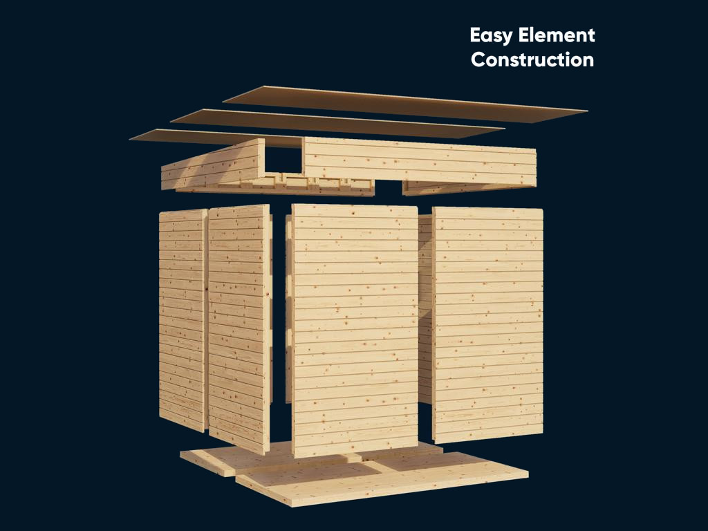 • Alle onderdelen volledig geprefabriceerd - geen zagen of schroeven van afzonderlijke wandplanken nodig.