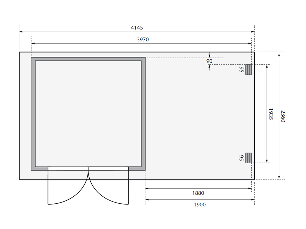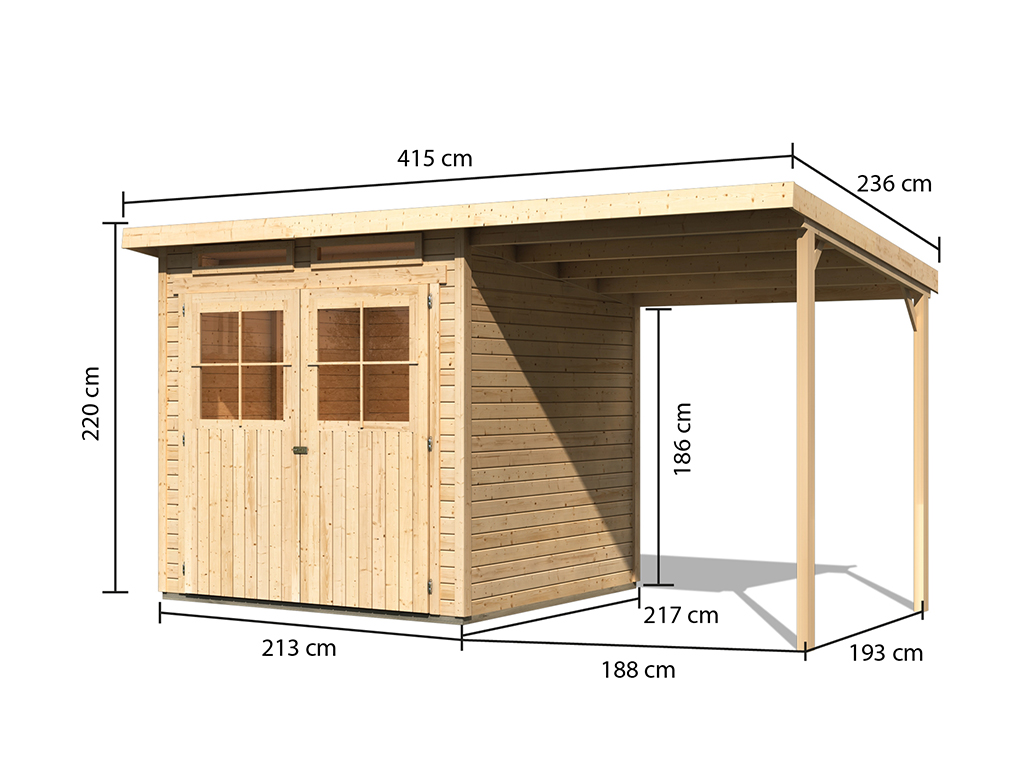 B x D x H: 415 x 236 x 220 cm, Basisafmeting huis: B x D: 209 x 213 cm, incl. 1,9 m aanbouwdak