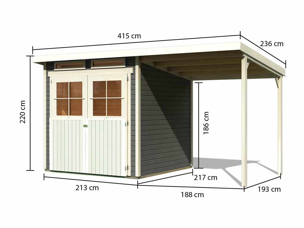 B x D x H: 415 x 236 x 220 cm, funderingsmaat huis: B x D: 209 x 213 cm, incl. 1,9 m aanbouwdak