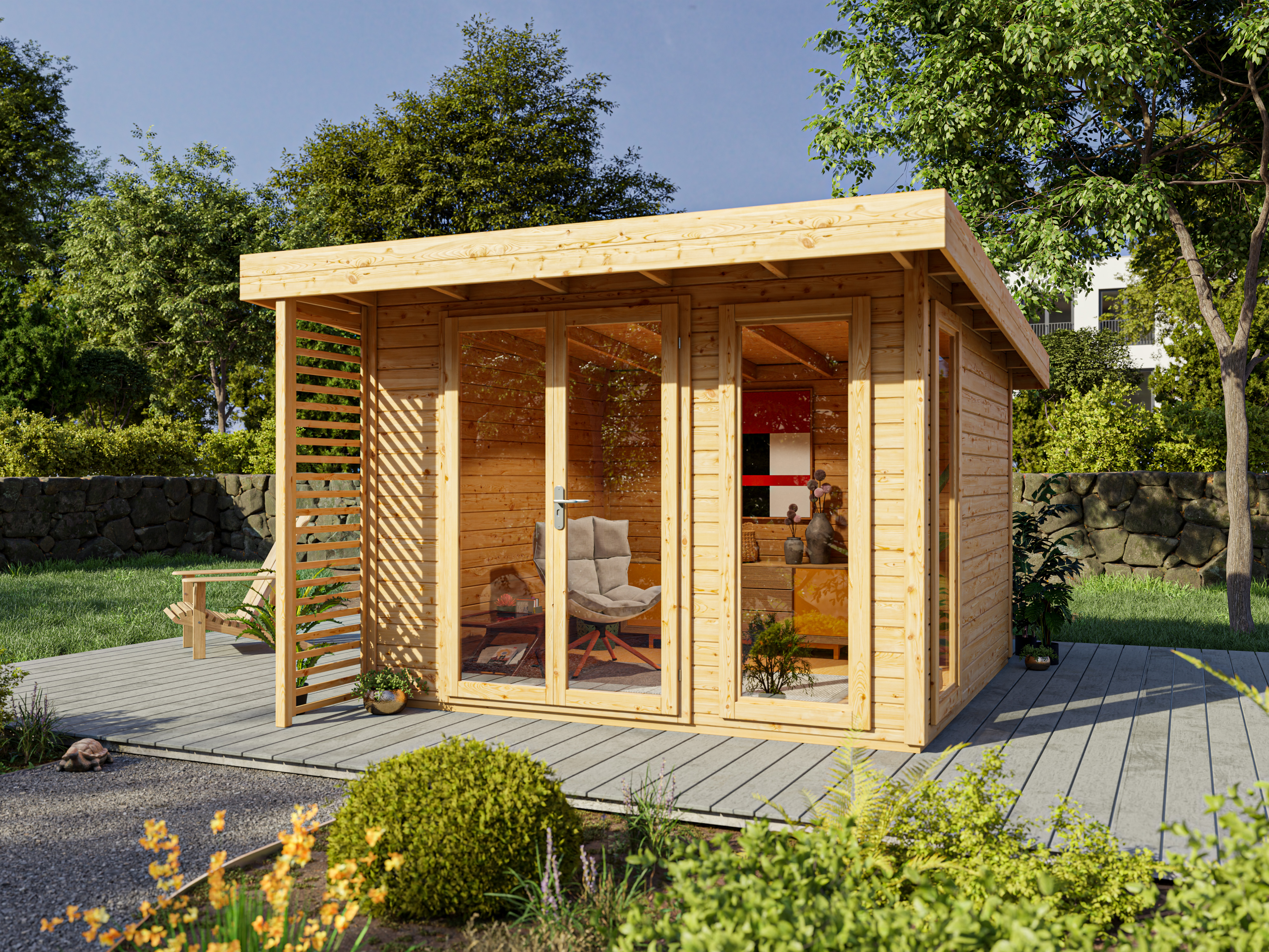 Dit moderne, lichtovergoten tuinhuis met lessenaarsdak is helemaal in de mode. Het tuinhuis valt op dankzij het moderne design en de decoratieve lamellenwand die een echte blikvanger in je tuin is en een overstek van 69 cm biedt. Praktisch en compact past dit pareltje in bijna elke moderne tuin en is het de ideale plek voor jouw tuinkantoor.