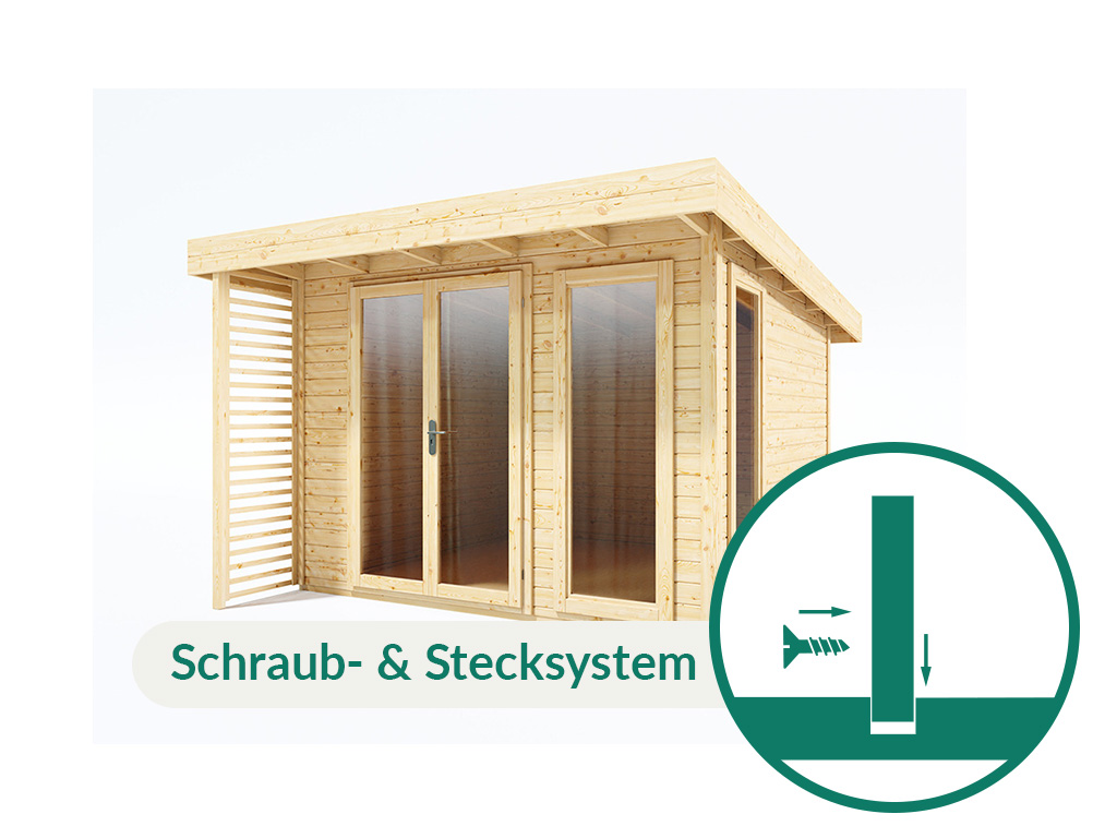 Het tuinhuis kan worden uitgebreid met een 2,5 m brede aanbouw met zij- en achterwand aan de vensterzijde van het tuinhuis. Bekijk onze variantenkeuze voor meer informatie. Een vloer is niet bij de levering inbegrepen, maar kan op aanvraag worden aangeboden.