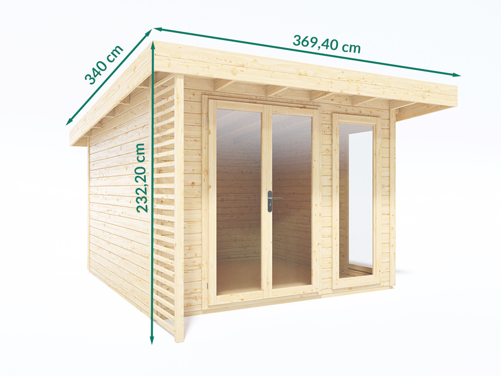 B x D x H: 340 x 369,4 x 232,2 cm, Vloermaat huis: B x D: 300 x 300 cm, incl. glazen deur met houten kozijn & twee ramen