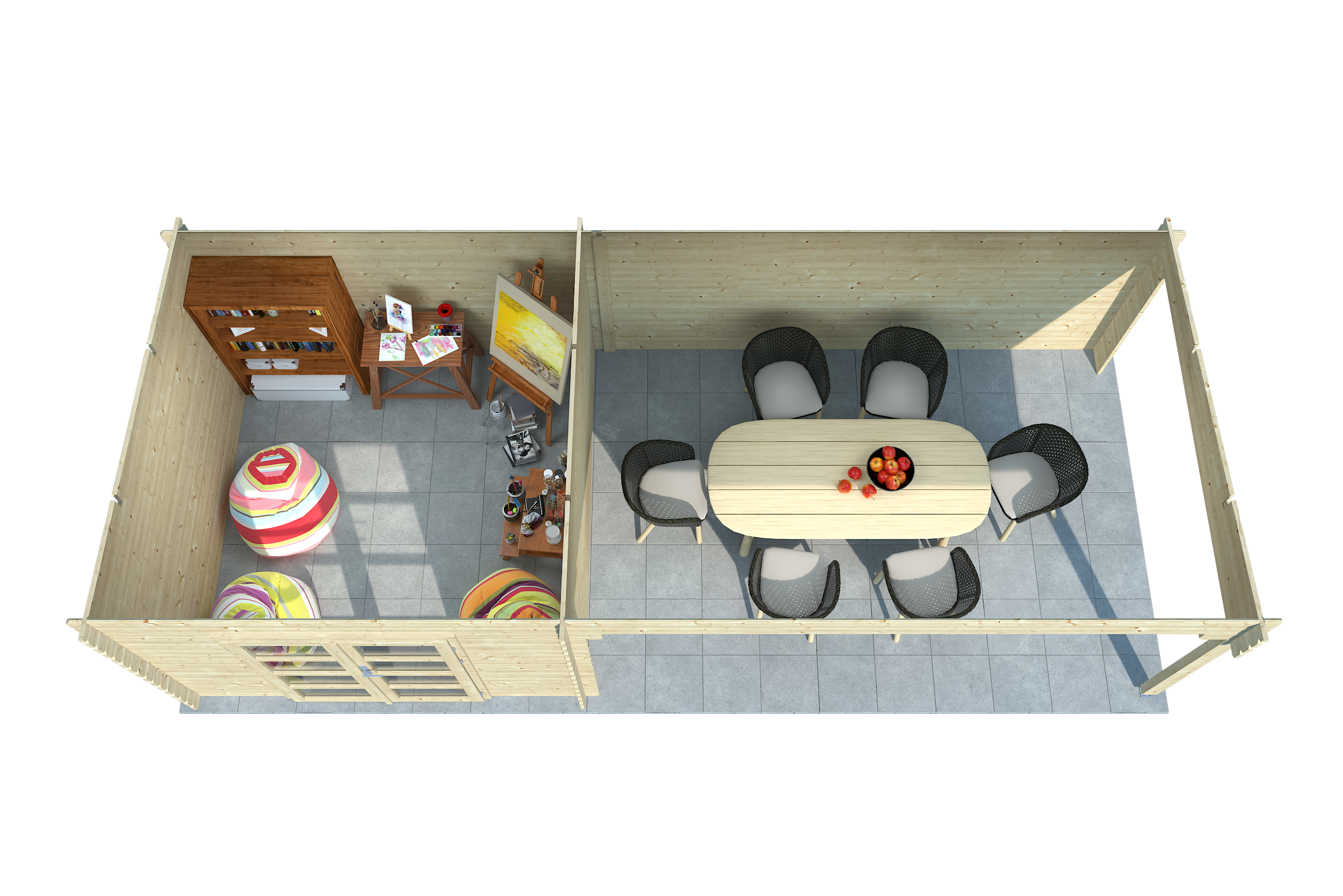 Het tuinhuis Vilma kenmerkt zich door zijn zorgvuldig bewerkte 34 mm dikke balken met groef- en tandverbinding. De traditionele hoekverbinding maakt een bijzonder hoge stabiliteit mogelijk. Wij adviseren een houtbeschermende laag met open poriën en een weerbestendige verf. - Grote lichtuitsparingen voor meer licht