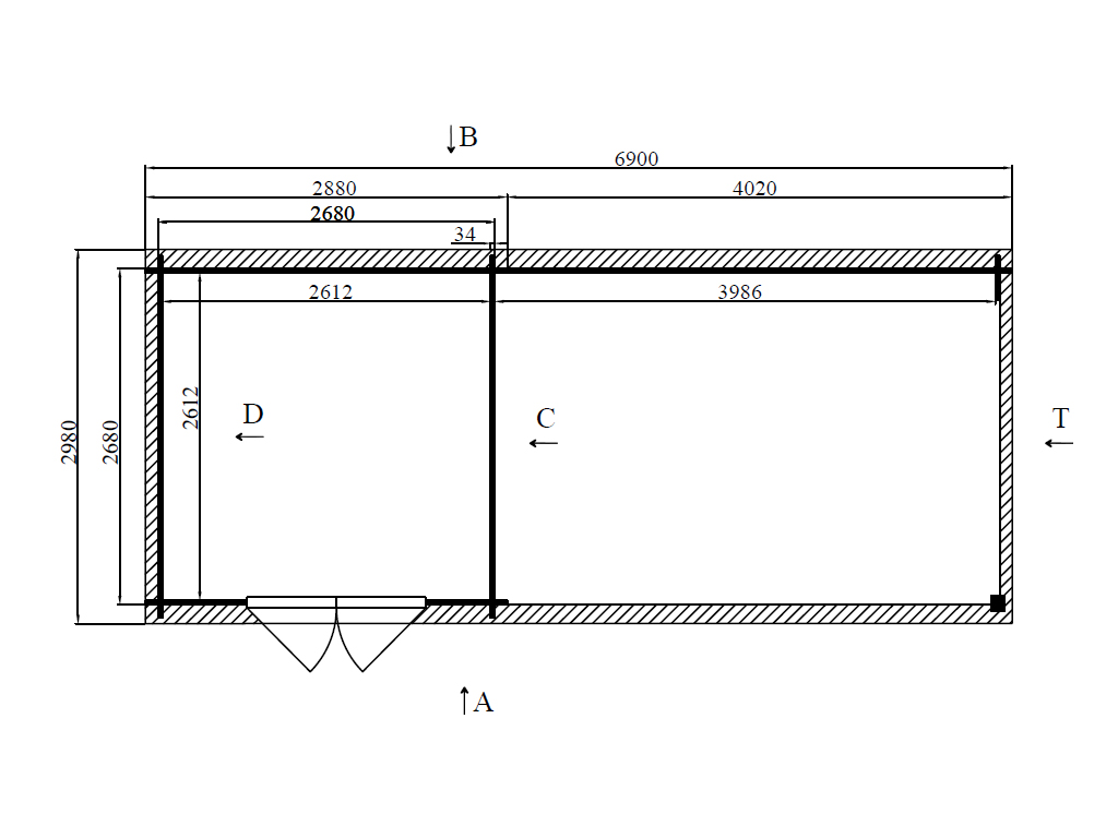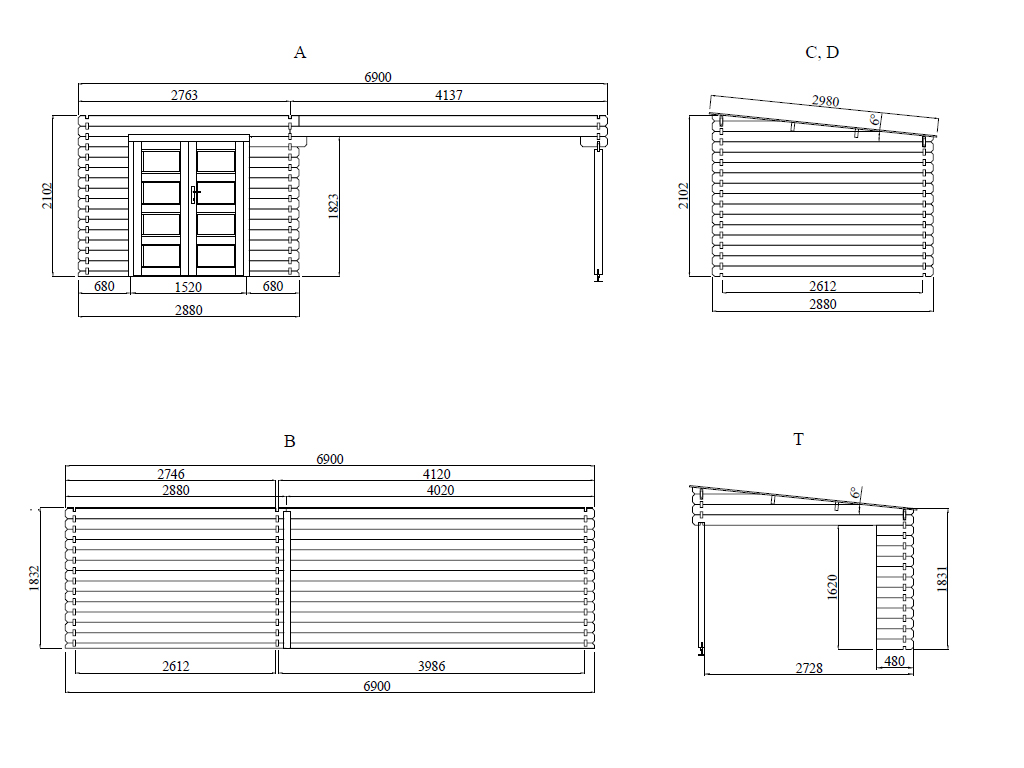 | Basisafmeting huis incl. aanbouwelementen (B x D): | 690 x 268 cm |