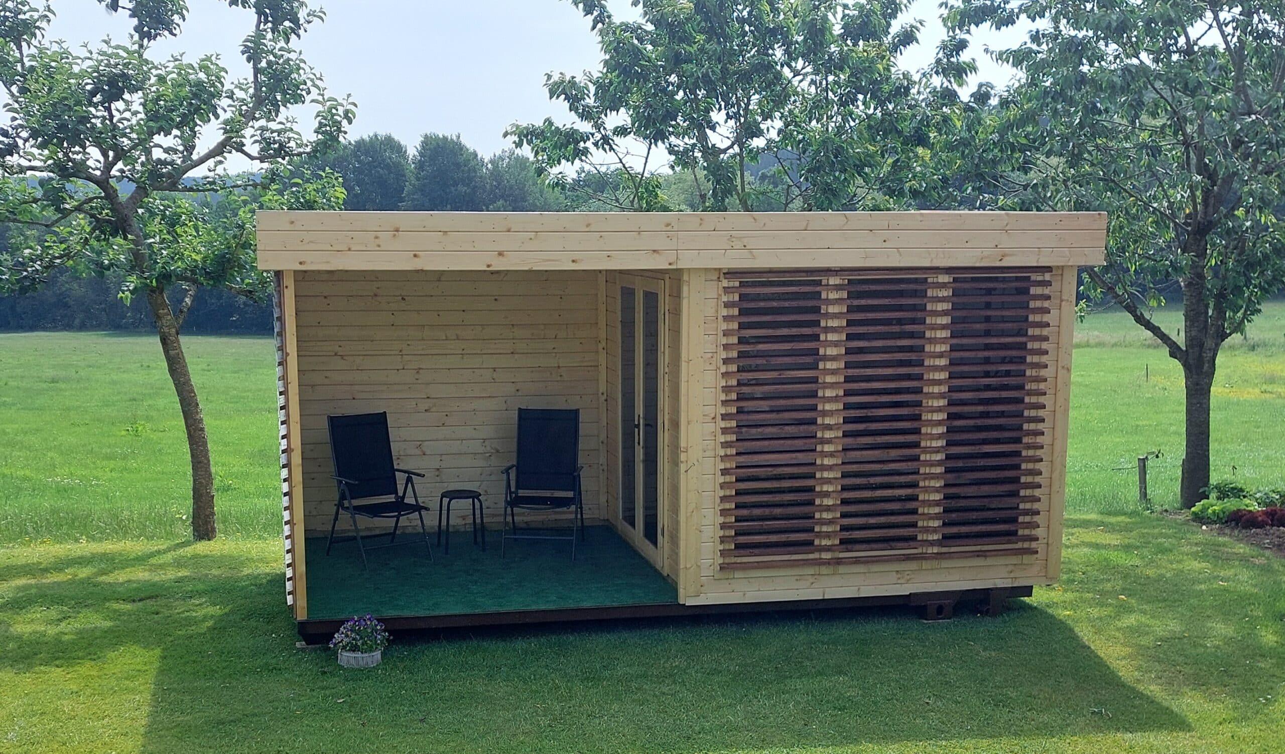 Het tuinhuis is uitgerust met een 264 cm brede aanbouw. - Volledig glazen deur