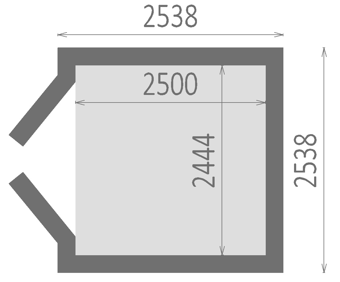 | Inwendige afmeting huis / grootste kamer (B x D cm): | 244,4 x 250 cm |