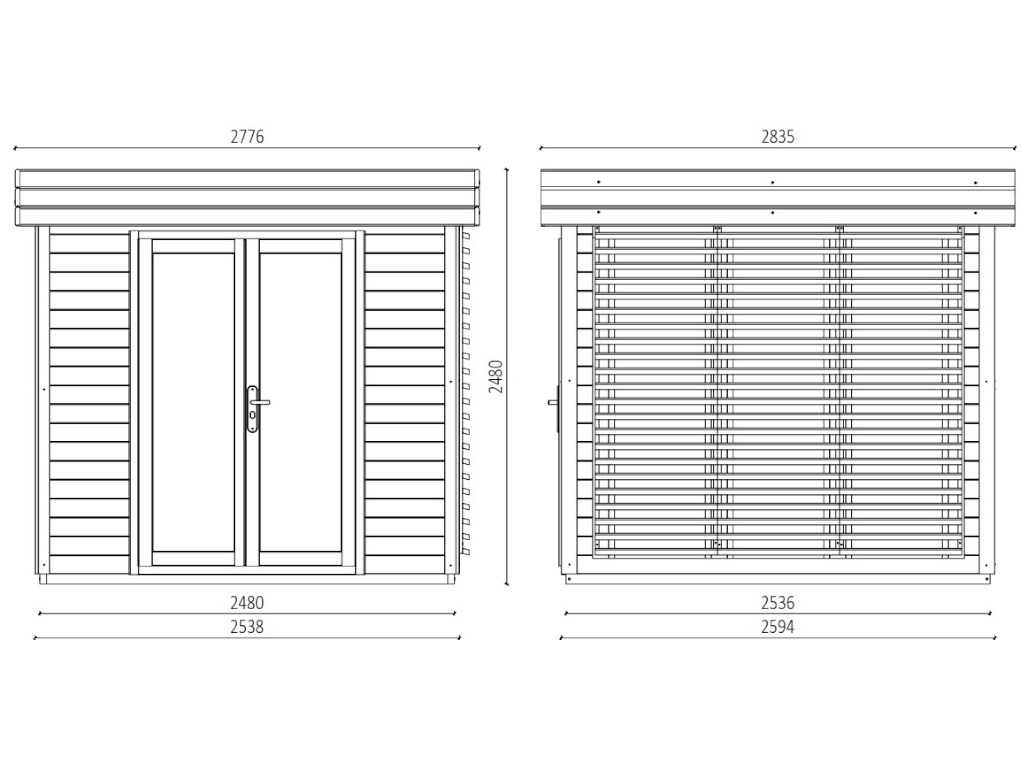 B x D x H: 534 x 278 x 248 cm, Basisafmeting huis: B x D: 253,6 x 248 cm, incl. groot raam voorzijde + 250 cm aanbouw