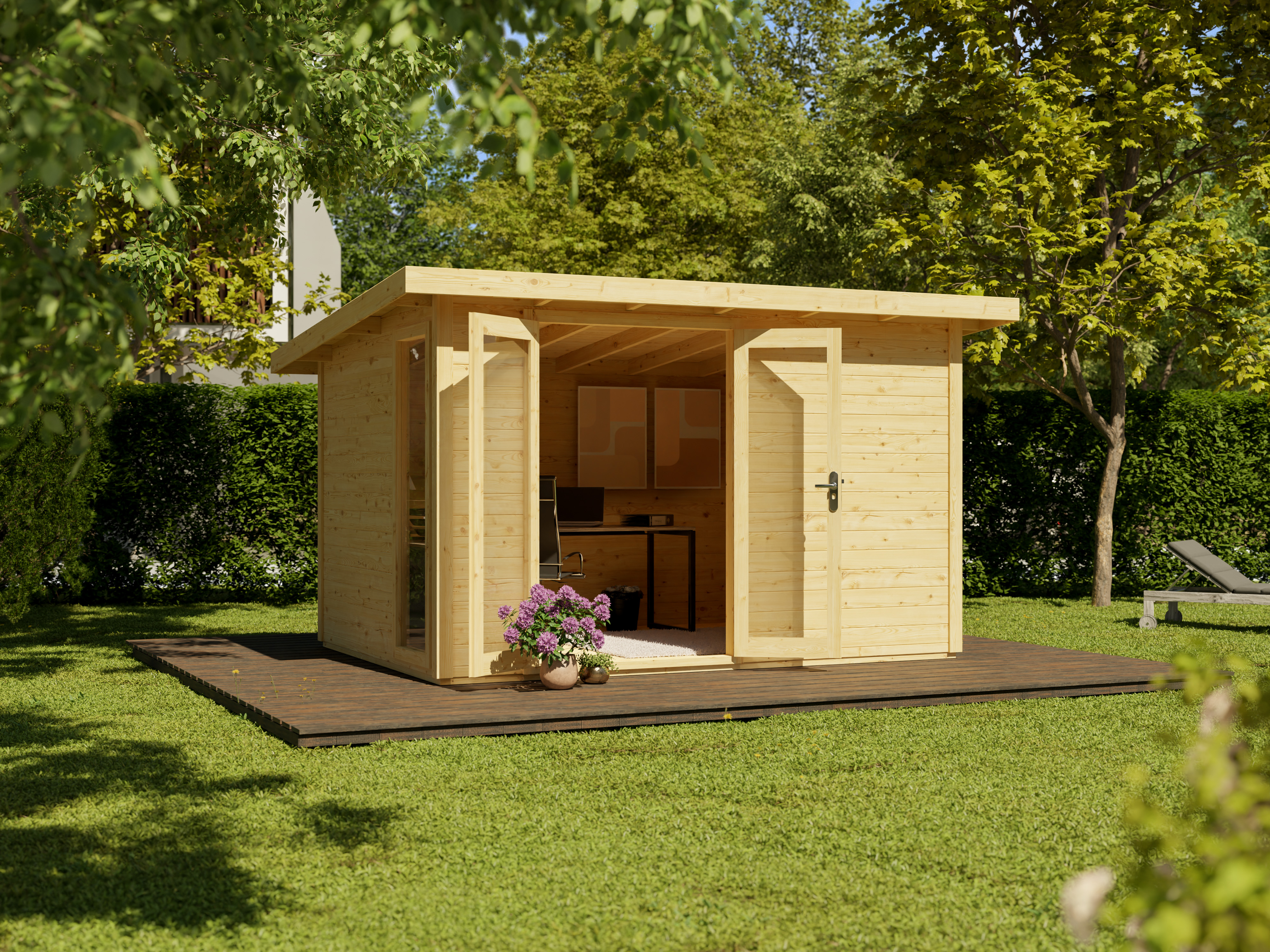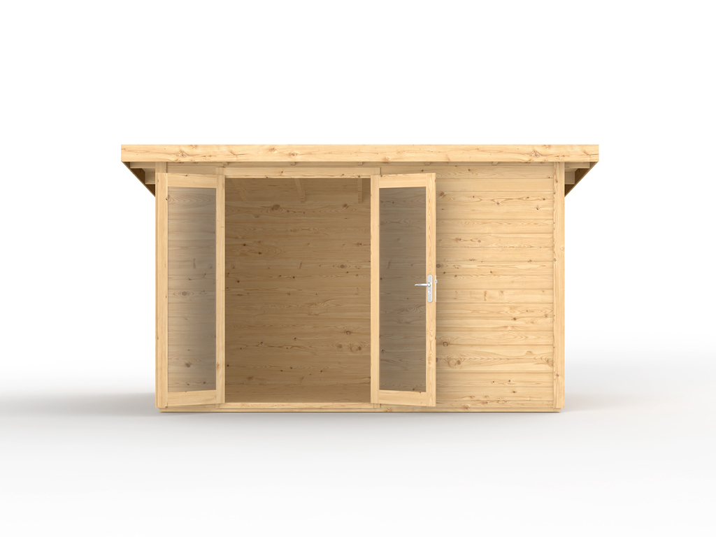 Het tuinhuis wordt gekenmerkt door zijn 28 mm dikke wandplanken gemaakt van natuurlijk sparrenhout. Daarom adviseren wij voor de eerste winter een beschermende verflaag met impregnatie en een laag openporige houtverduurzamingsbeits. - Volledig glazen deur