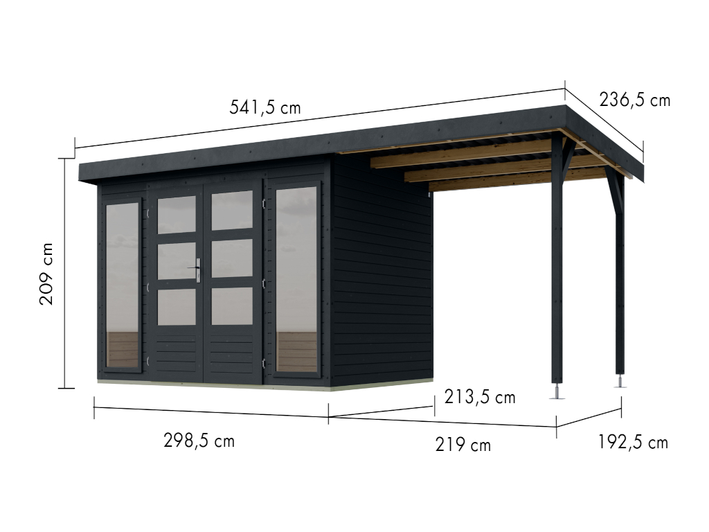 B x D x H: 541,5 x 236 x 209 cm, incl. 2,2 m aanbouwdak