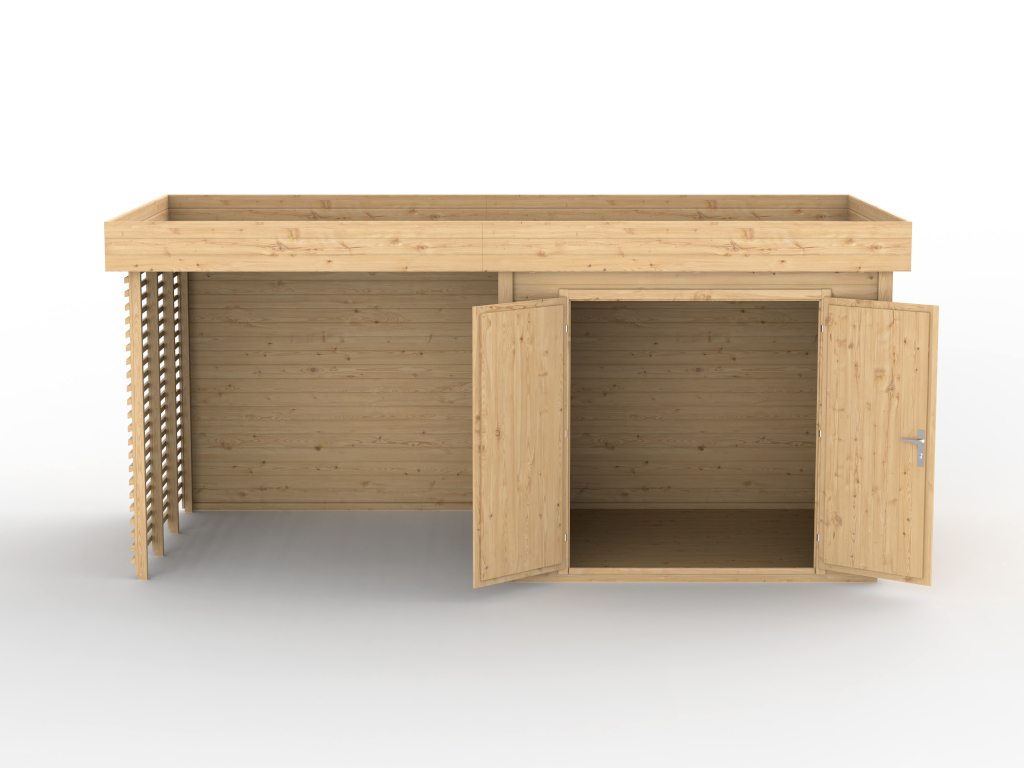 Het moderne platte dak is gemaakt van 16 mm dikke dakplaten. Dankzij een doordacht licht hellend dakvlak kan het regenwater optimaal weglopen. De tuinschuur wordt geleverd met dakleer voor de eerste dakbedekking. Voor een langdurige bescherming adviseren wij zelfklevende dakbedekking. - Dubbele vleugeldeur