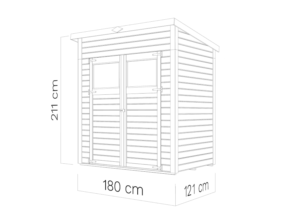 De grondoppervlak van het tuinhuis is 2,16 m². De funderingsmaat (huis zonder aanbouw) bedraagt 180 x 121 cm (B x D). De funderingsmaat bedraagt 180 x 121 cm (B x D). Dankzij de nokhoogte van 211 cm kun je de ruimte optimaal benutten.