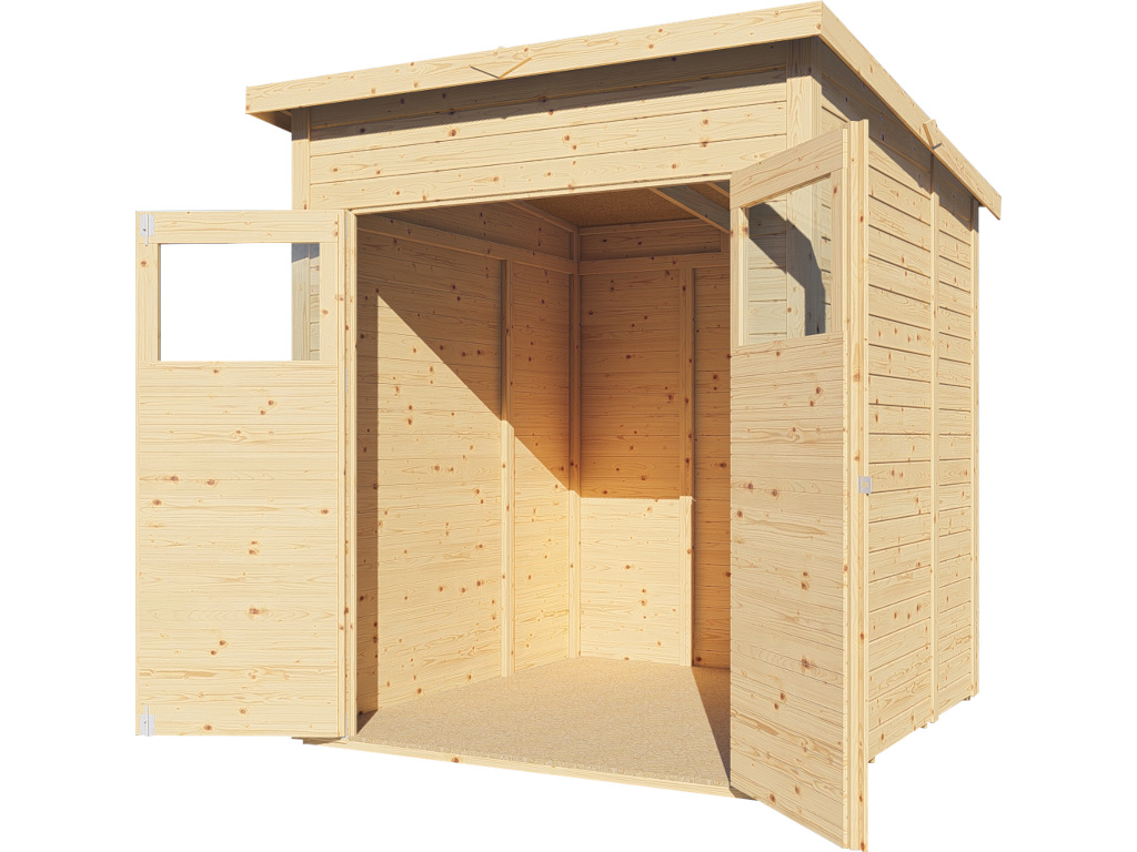 Een modern lessenaarsdak van massief hout met mes-en-groef verbinding geeft je tuinhuis een stijlvolle en elegante uitstraling. Dankzij slechts één hellende dakzijde wordt de gebruiksruimte binnenin nauwelijks beperkt en is het verlies aan bruikbare ruimte minimaal. Bovendien zorgt de hellende zijde van het lessenaarsdak voor een goede afvoer van regenwater, wat maar één dakgoot vereist.