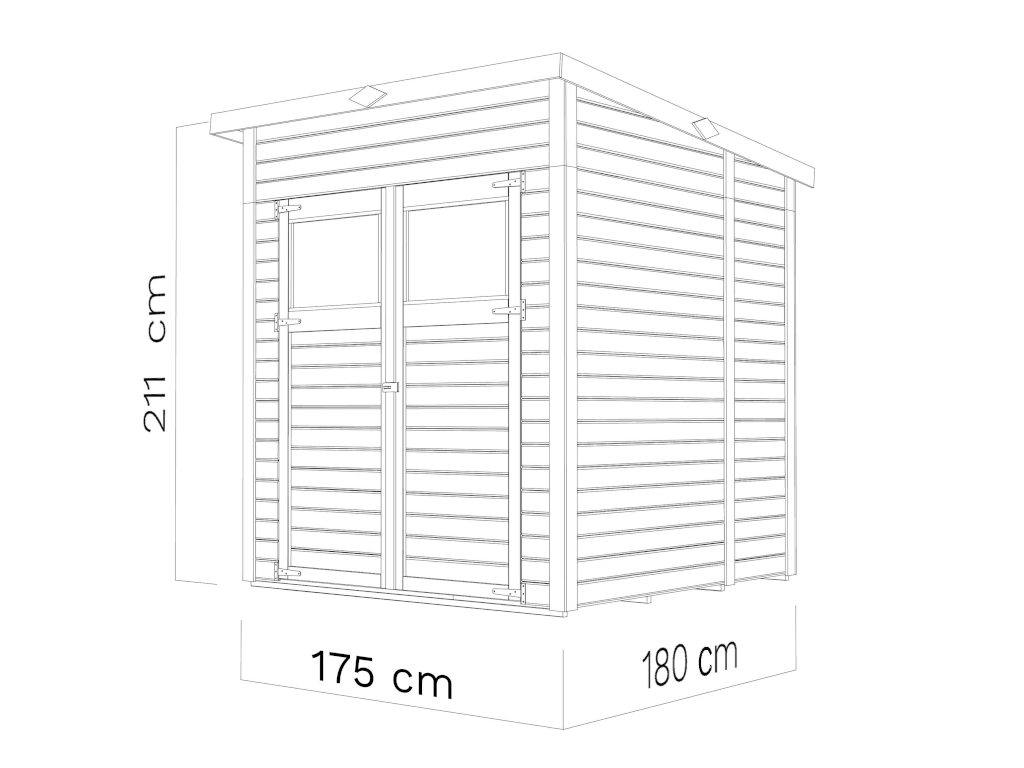 De vloeroppervlak van het tuinhuis bedraagt 3,15 m². Het sokkelmaat (huis zonder aanbouw) is 174 x 180 cm (B x D). Een optimale benutting van de ruimte wordt gewaarborgd dankzij een nokhoogte van 211 cm.