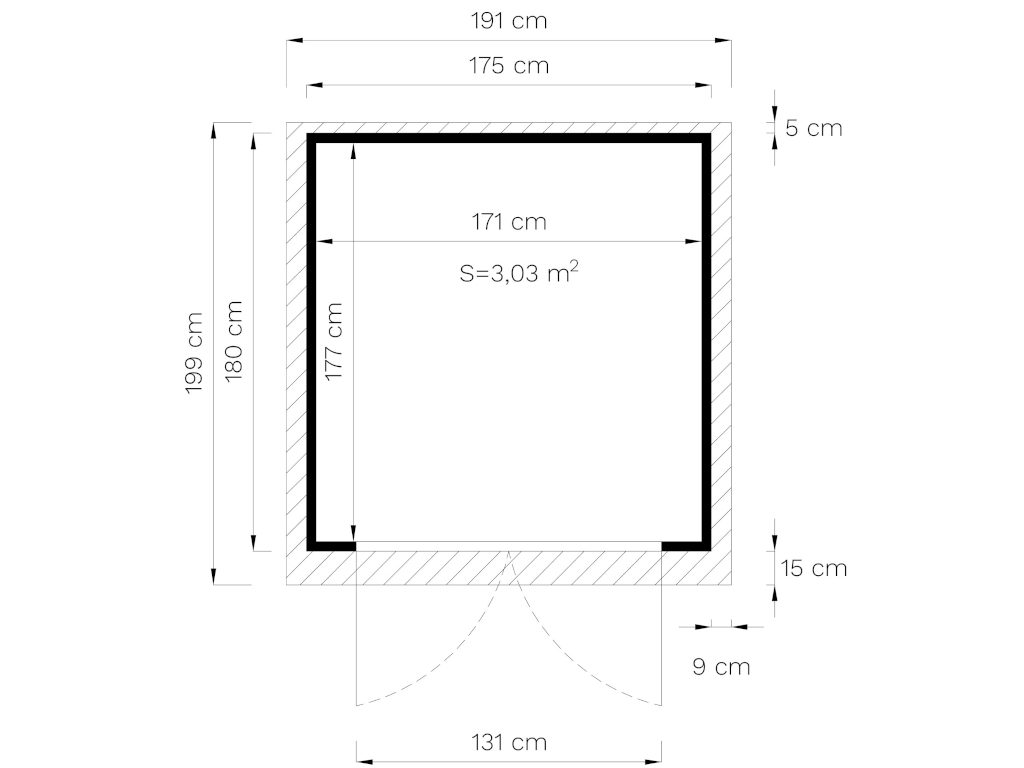 De grondoppervlakte van dit tuinhuis is 3,15 m². De funderingsmaat (huis zonder aanbouw) is 174 x 180 cm (B x D). De funderingsmaat is 174 x 180 cm (B x D). Dankzij de nokhoogte van 211 cm kun je de ruimte optimaal benutten.
