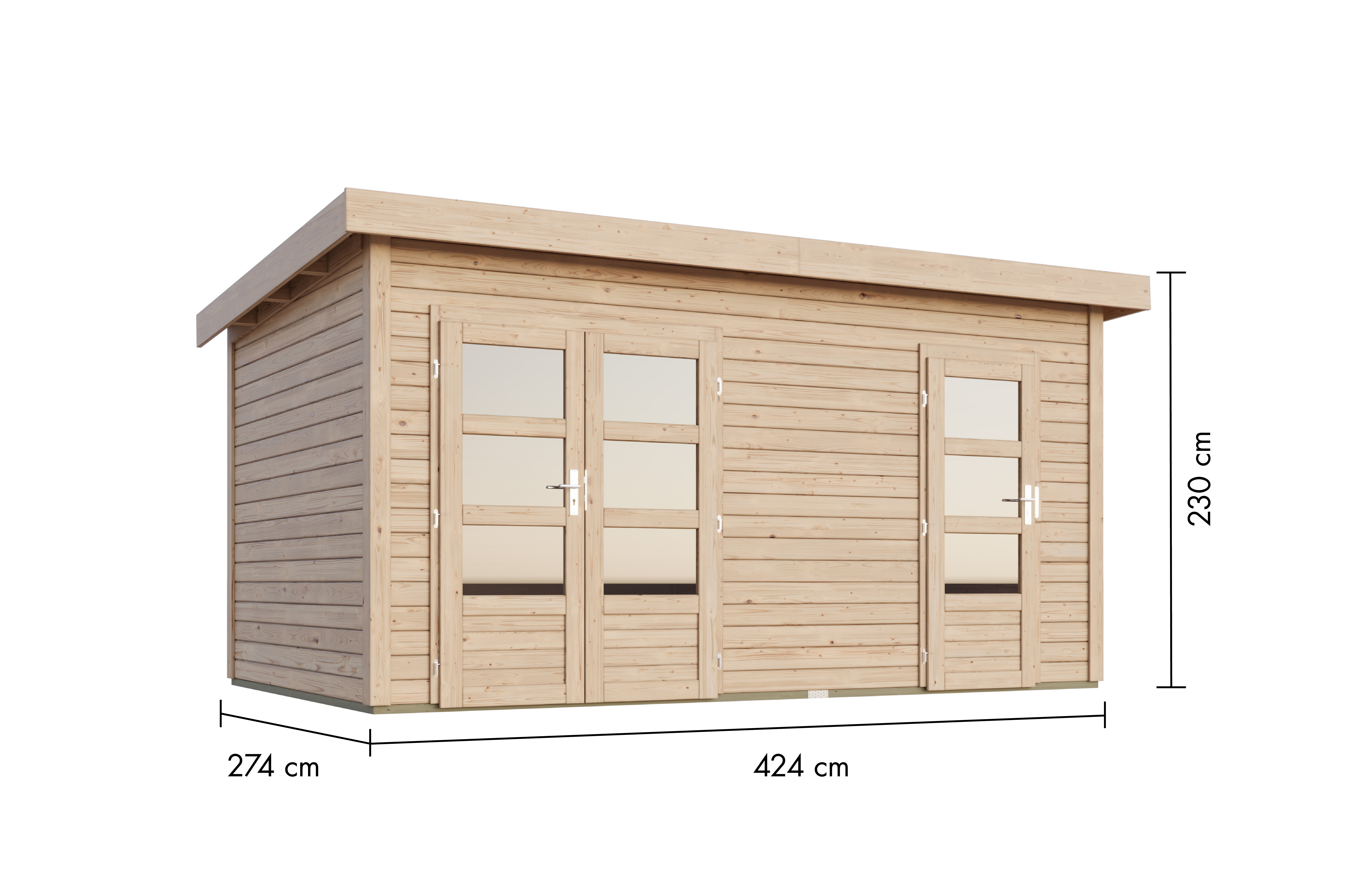 Het grondoppervlak van het tuinhuis bedraagt 11,34 m² met een basisafmeting van 420 x 270 cm (b x d). Door een nokhoogte van 230 cm is een optimale benutting van de ruimte gegarandeerd.