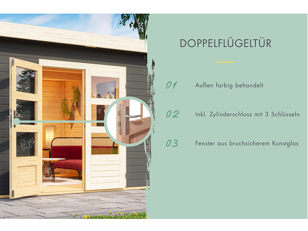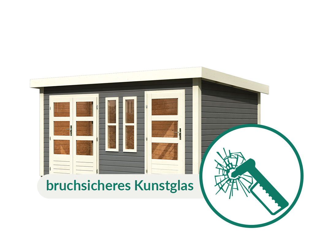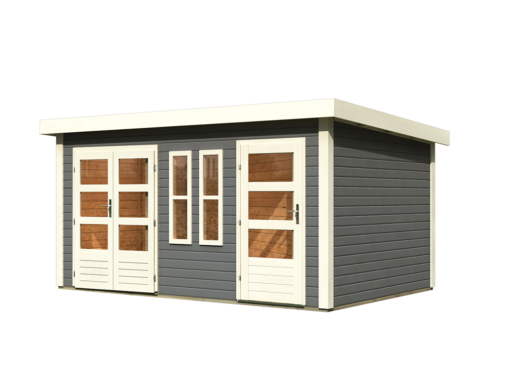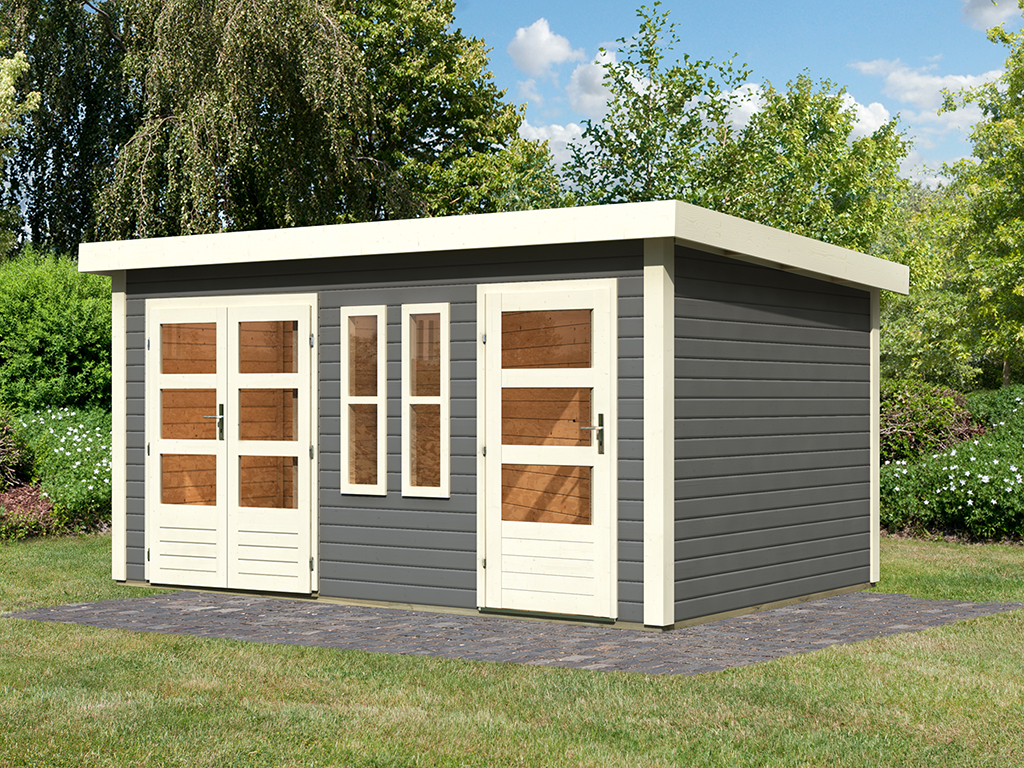 Met dit tuinhuis met plat dak haal je een eigentijdse blikvanger in je tuin. De twee ruimtes met scheidingswand en eigen ingang maken het ideaal als knusse zithoek én als praktische tuinberging. - Direct goed beschermd