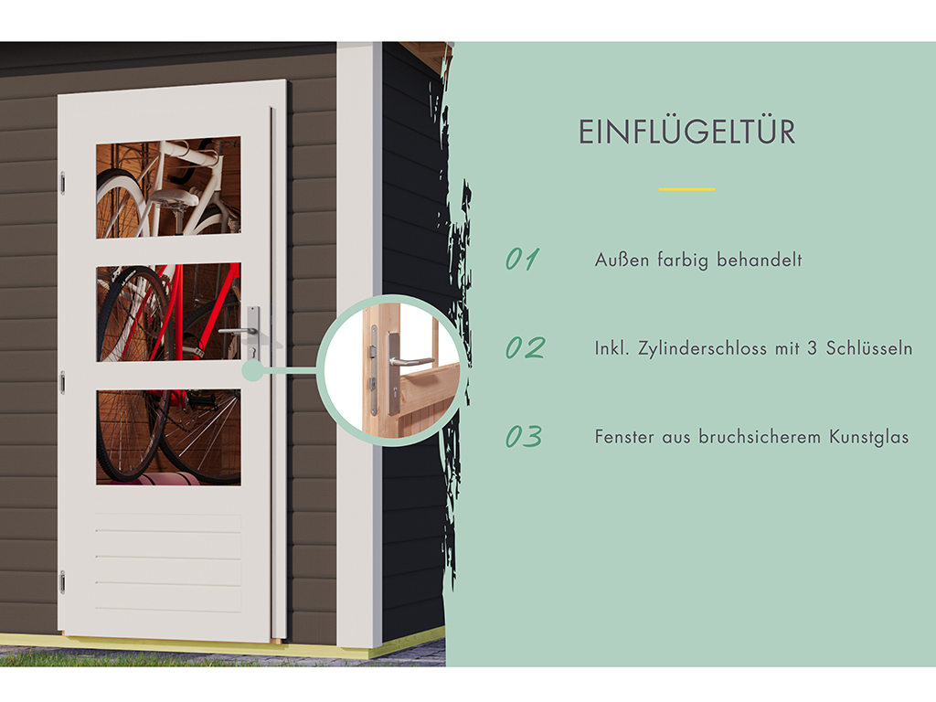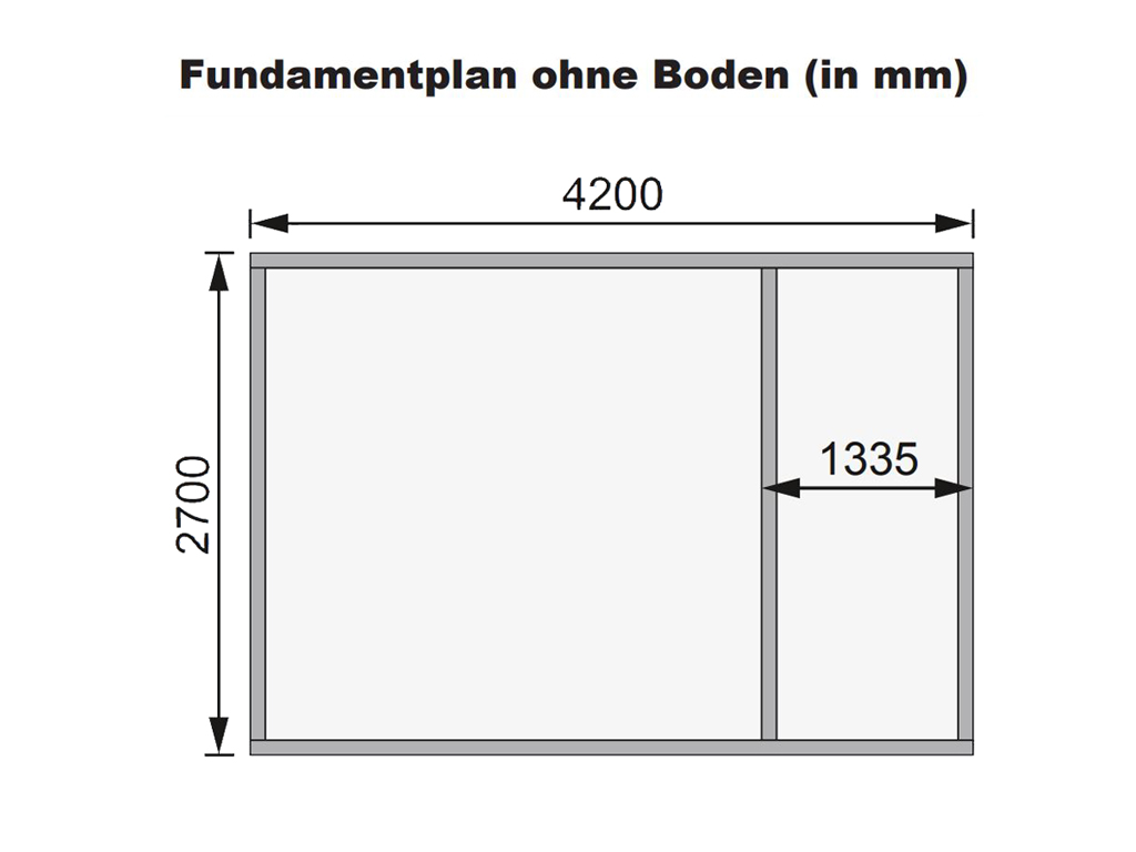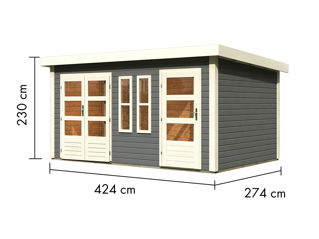 B x D x H: 424 x 274 x 230 cm, funderingsmaat huis: B x D: 420 x 270 cm, inclusief dubbele deur + enkele deur + 2 ruimtes
