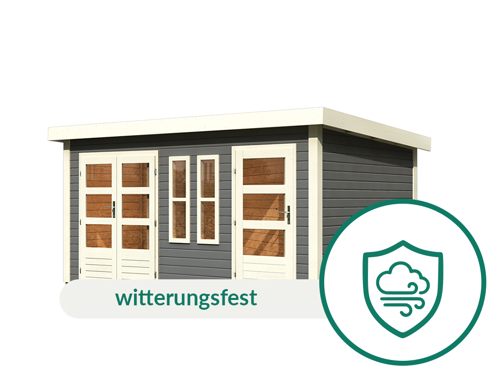 De buitenwanden van dit tuinhuis zijn al afgewerkt met een houtbeschermende beits in de kleur Terragrijs en beschermen vanaf dag één tegen aantasting en weersinvloeden. - Snel en eenvoudig te monteren