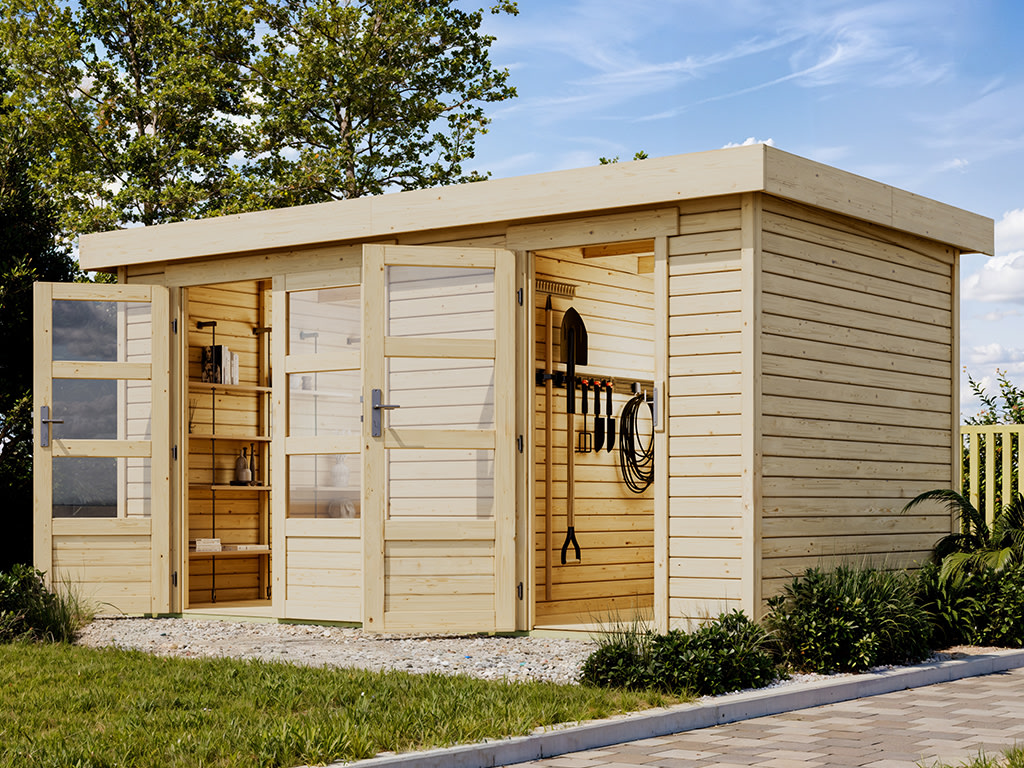 Dit tuinhuis met 2 ruimtes biedt veel plaats en is multifunctioneel inzetbaar. Dankzij de tussenwand met twee aparte ingangen kun je dit tuinhuis zowel als gezellige ontspanningsplek als voor het opbergen van tuingereedschap gebruiken.