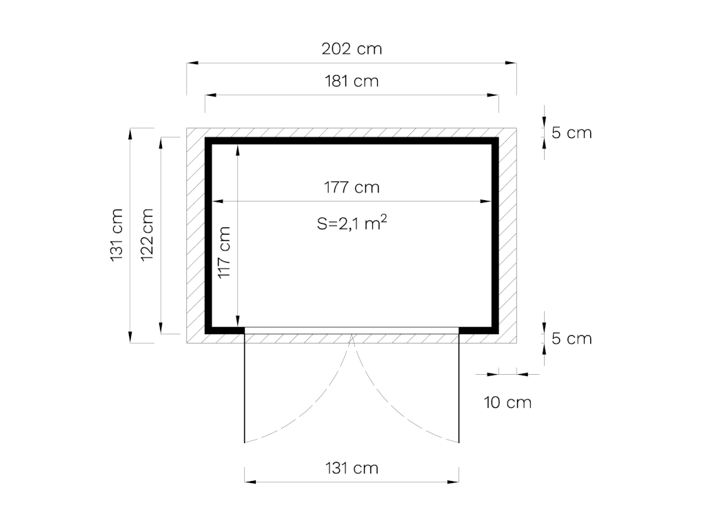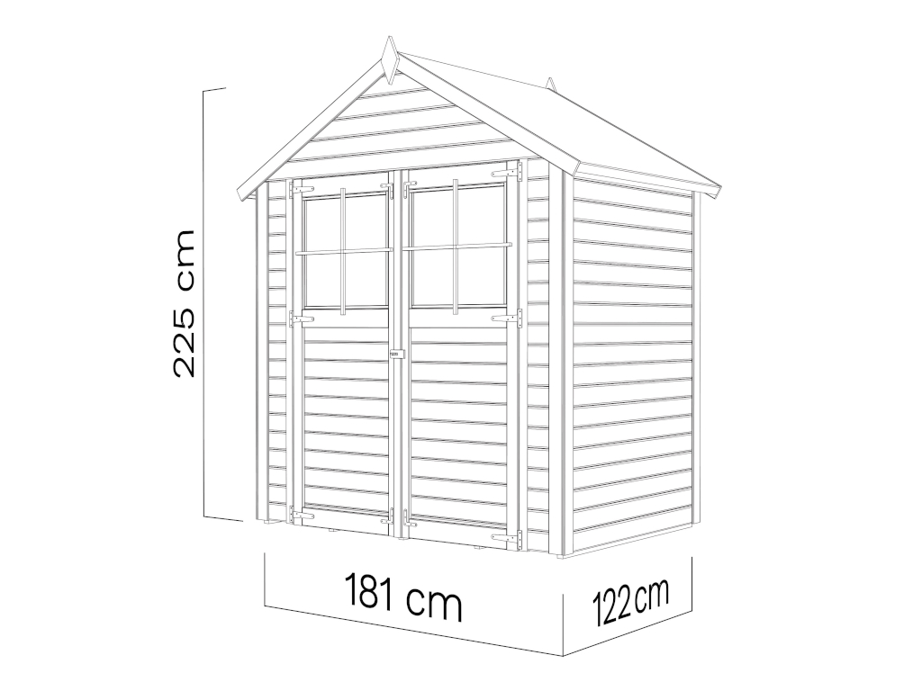 De grondoppervlakte van dit tuinhuis is 2,21 m². De funderingsmaat (huis zonder aanbouw) bedraagt 181 x 122 cm (B x D). De funderingsmaat bedraagt 181 x 122 cm (B x D). Dankzij de nokhoogte van 225 cm kun je de ruimte optimaal benutten.