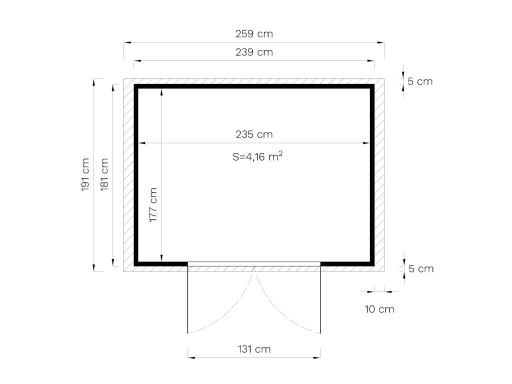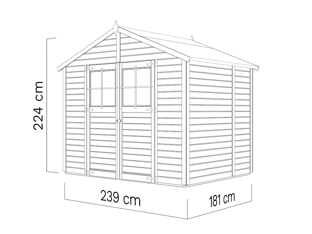 De grondoppervlak van dit tuinhuis bedraagt 4,33 m². De funderingsmaat (huis zonder aanbouw) is 239 x 181 cm (B x D). De funderingsmaat is 239 x 181 cm (B x D). Dankzij de nokhoogte van 223 cm benut je de ruimte optimaal.
