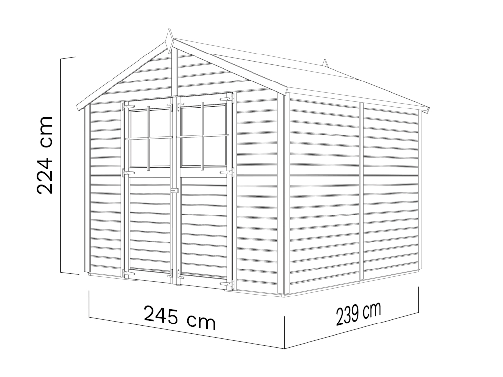 De grondoppervlak van dit tuinhuis is 5,83 m². De funderingsmaat (huis zonder aanbouw) bedraagt 245 x 238 cm (B x D). De funderingsmaat bedraagt 245 x 238 cm (B x D). Dankzij de nokhoogte van 223 cm wordt de beschikbare ruimte optimaal benut.