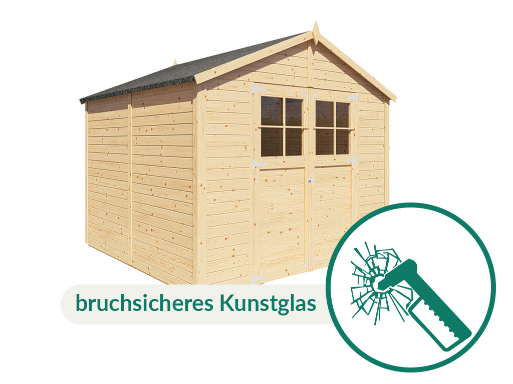 De vloer is inbegrepen. Deze is bijzonder draagkrachtig; het hoogwaardige massieve hout zorgt voor goede statische eigenschappen en extra stabiliteit. Zware tuingereedschappen en machines kunnen dus probleemloos worden geplaatst. De afzonderlijke vloerdelen zijn met het meegeleverde montagemateriaal eenvoudig te monteren.