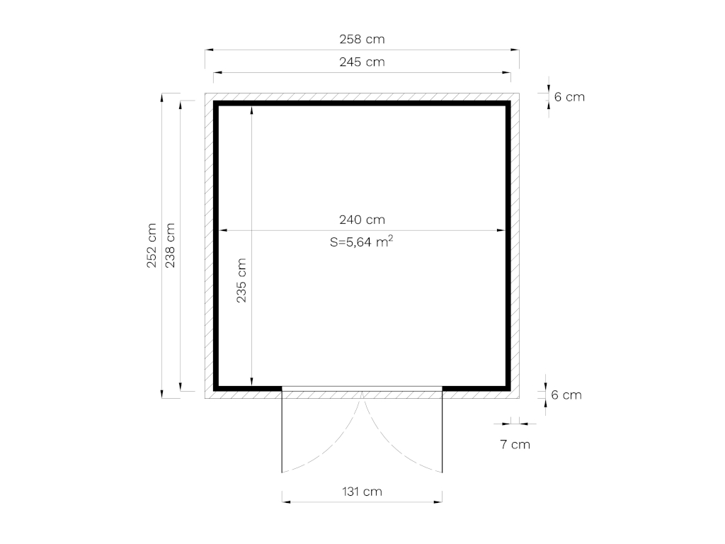 De grondoppervlak van dit tuinhuis is 5,83 m². De funderingsmaat (huis zonder aanbouw) bedraagt 245 x 238 cm (B x D). De funderingsmaat bedraagt 245 x 238 cm (B x D). Dankzij de nokhoogte van 223 cm wordt de beschikbare ruimte optimaal benut.
