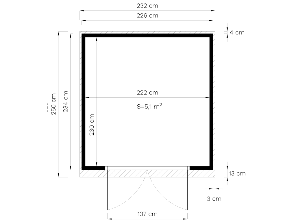 Het grondoppervlak van dit tuinhuis is 5,11 m². De funderingsmaat bedraagt 226 x 234 cm (B x D). Dankzij de nokhoogte van 232 cm benut je de ruimte binnen optimaal.